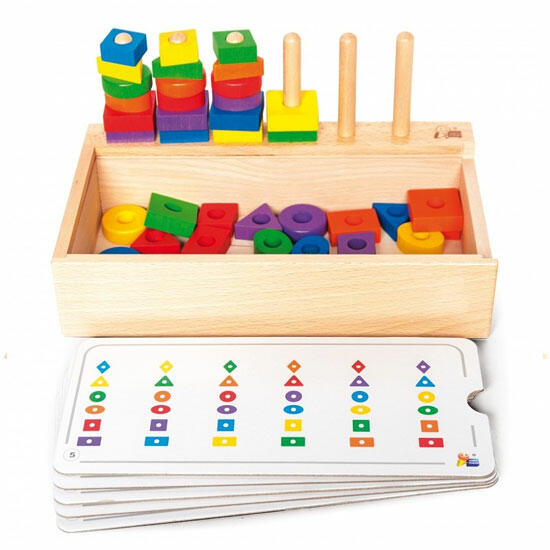 Este jogo educativo é uma excelente ferramenta para apoiar a coordenação psicomotora das crianças, ao mesmo tempo que as ensina a distinguir cores e formas, desenvolvendo o sentido de observação e o pensamento lógico. A caixa de madeira, que serve como estojo para o conjunto, possui um mecanismo deslizante de fecho e seis orifícios para os pinos de madeira. No interior da caixa, encontram-se missangas coloridas de madeira, pinos de madeira e cartões com modelos de padrões.
