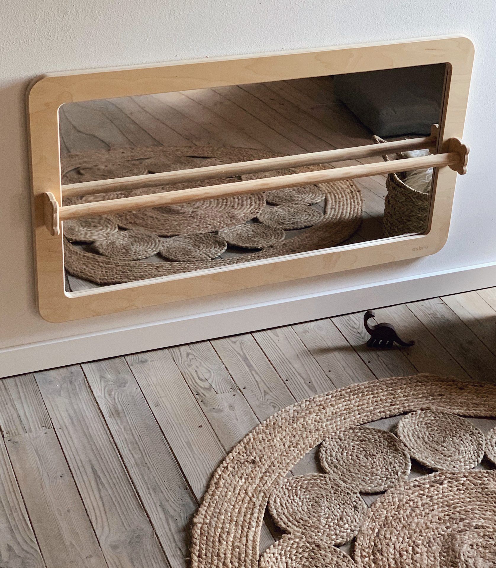 Fabricado com uma moldura em madeira laminada de bétula, o espelho tem dimensões de 110x60 cm e é especialmente concebido para uso infantil. A madeira utilizada provém de florestas sustentáveis com certificações FSC e PEFC, assegurando durabilidade e resistência a impactos. O espelho é entregue completamente montado e pronto a ser pendurado, e inclui um acabamento protetor especial, suave ao toque e fácil de limpar com água e sabão neutro.