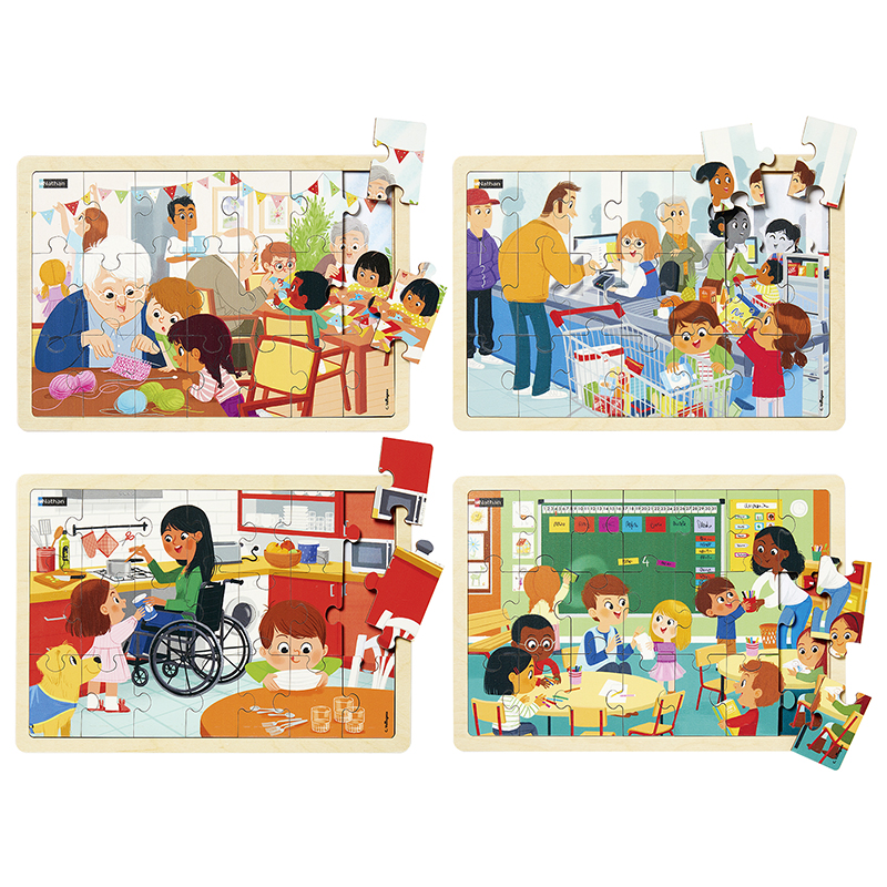 Estes quebra-cabeças podem ser montados com ou sem os modelos (removíveis). 2 níveis de dificuldade progressiva graças aos modelos frente e verso (cores ou preto e branco). Ilustrações ricas e coloridas impressas na madeira promovem a linguagem.