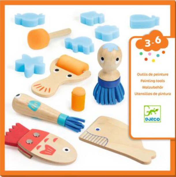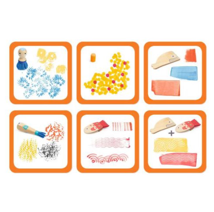 Indicado para crianças dos 3 aos 6 anos Inclui 6 ferramentas de madeira e 6 esponjas 10 cartões de instruções com ideias e técnicas de pintura