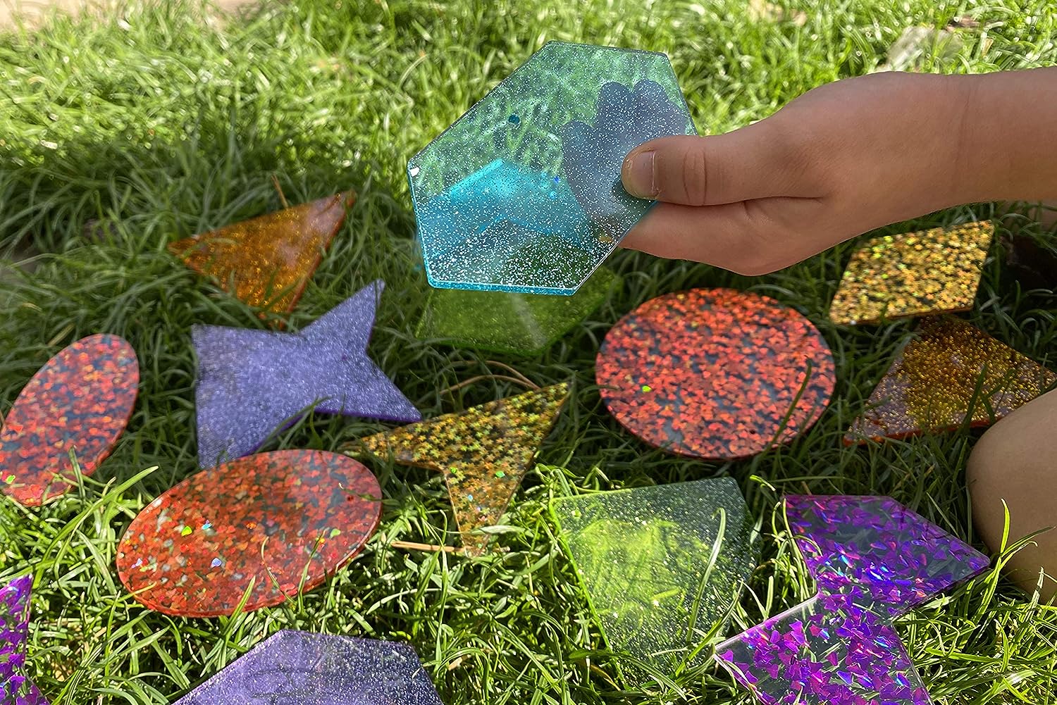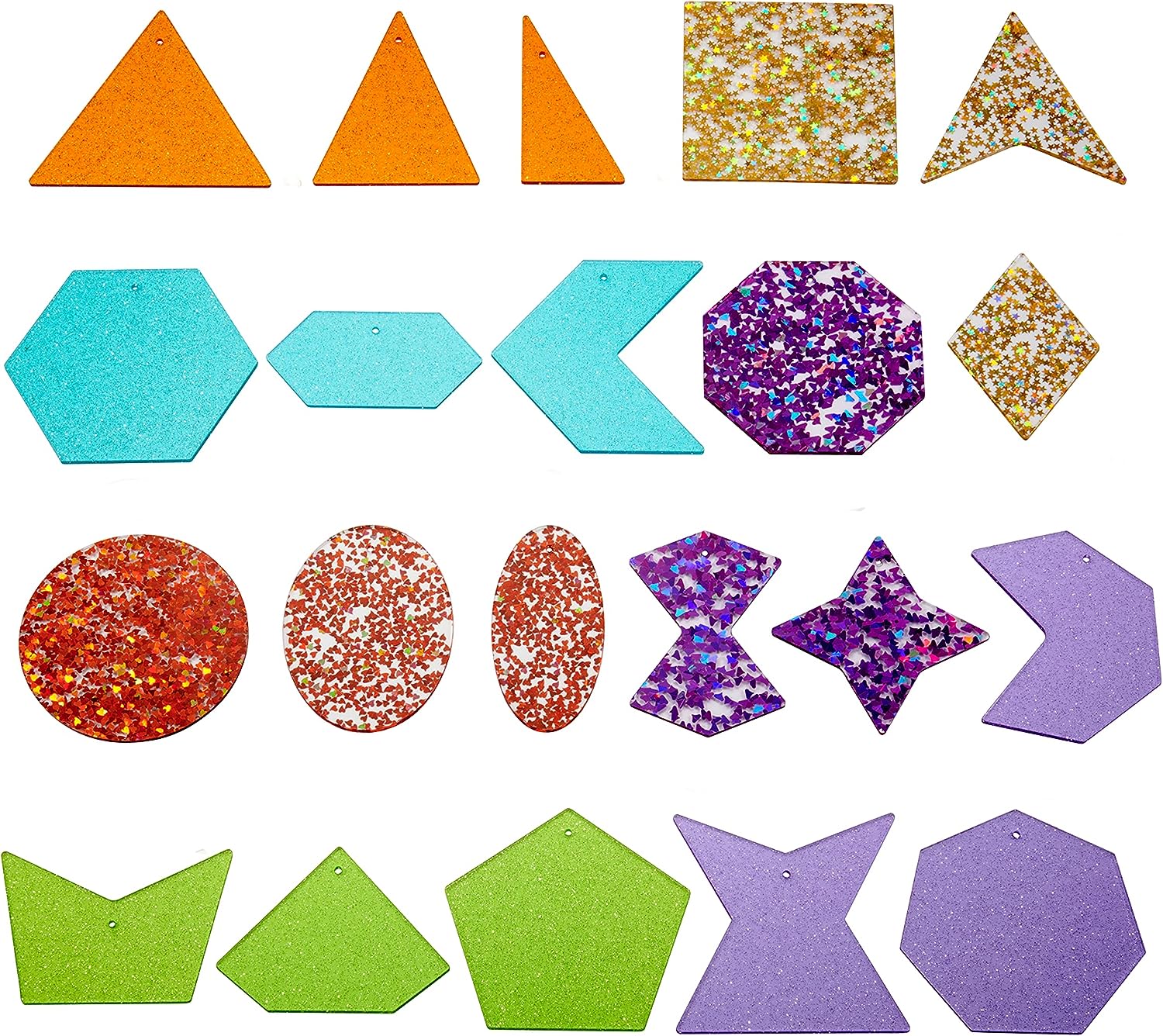21 formas em acrílico com glitter.