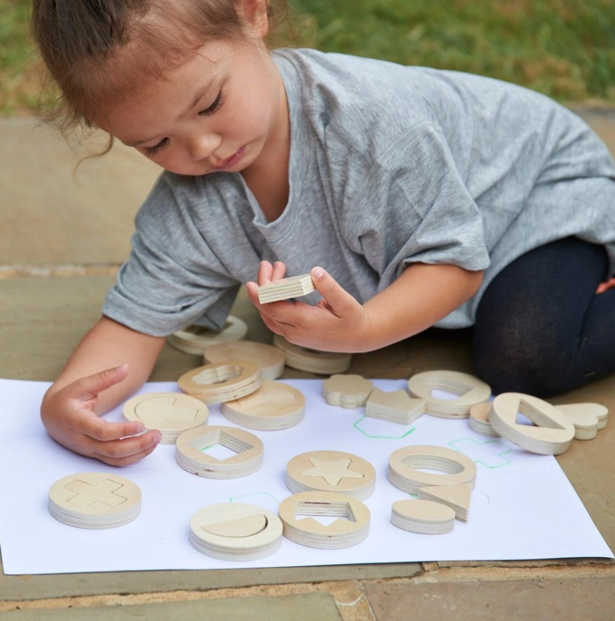 As Formas de Madeira Dentro e Fora são ideais para emparelhar, identificar formas 2D e suas características, descobrir simetrias básicas e atributos das formas, e incentivar o uso de linguagem matemática descritiva.