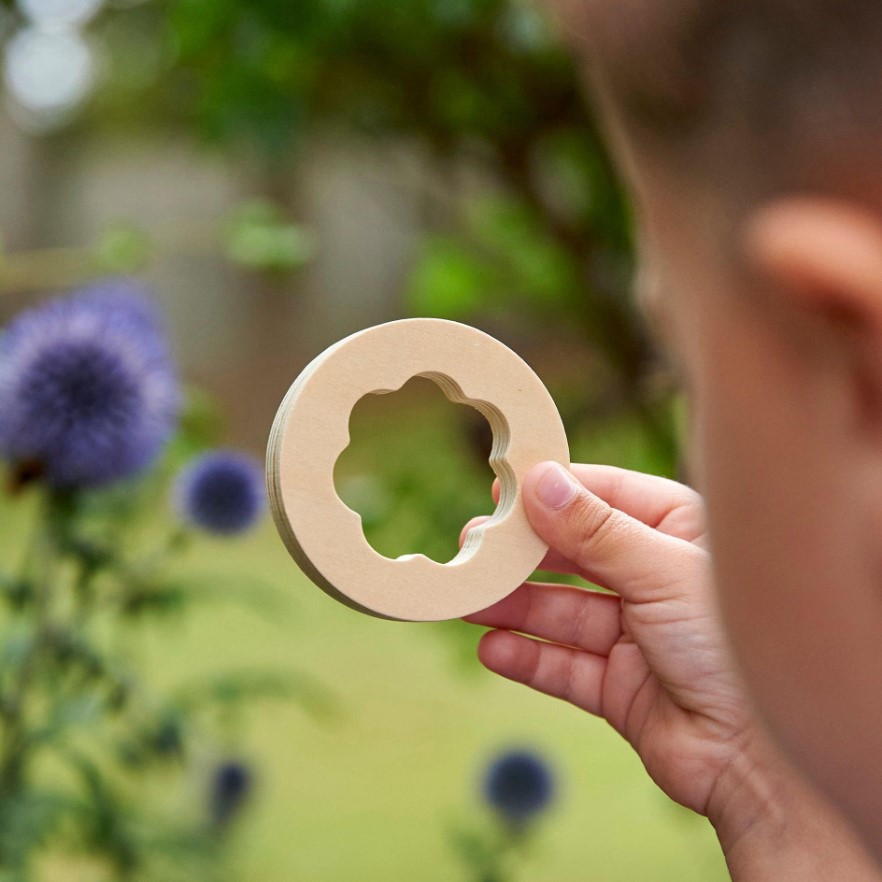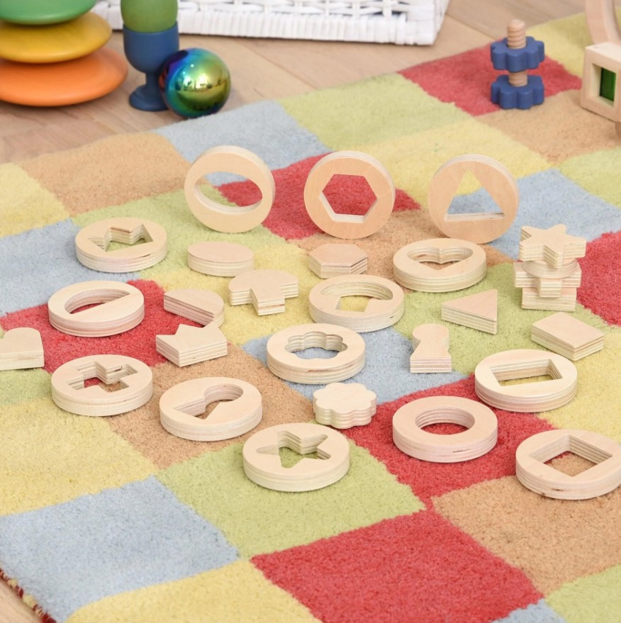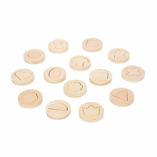 Este conjunto inclui 14 discos de madeira suaves e táteis, cada um com uma forma diferente recortada e encaixada dentro. As crianças podem remover as formas para traçar, desenhar ou criar padrões. As formas, com 1,2 cm de espessura, são robustas e fáceis de manusear por mãos pequenas.