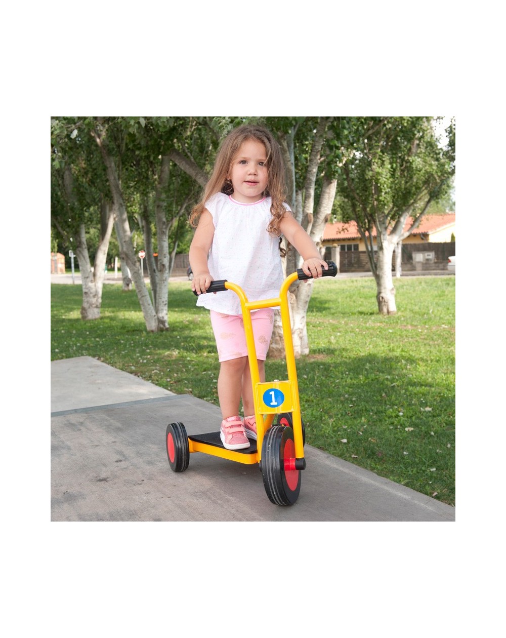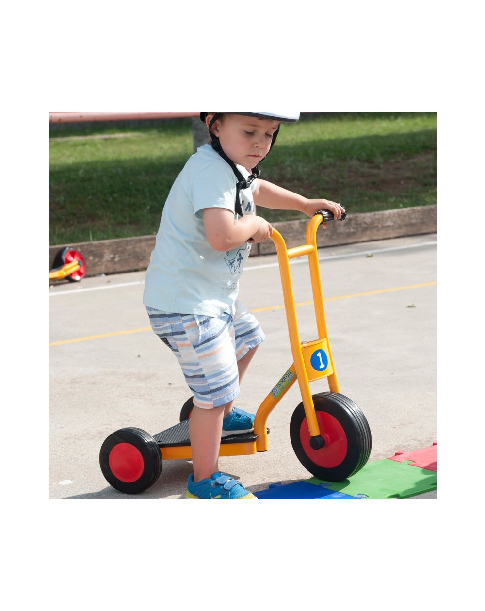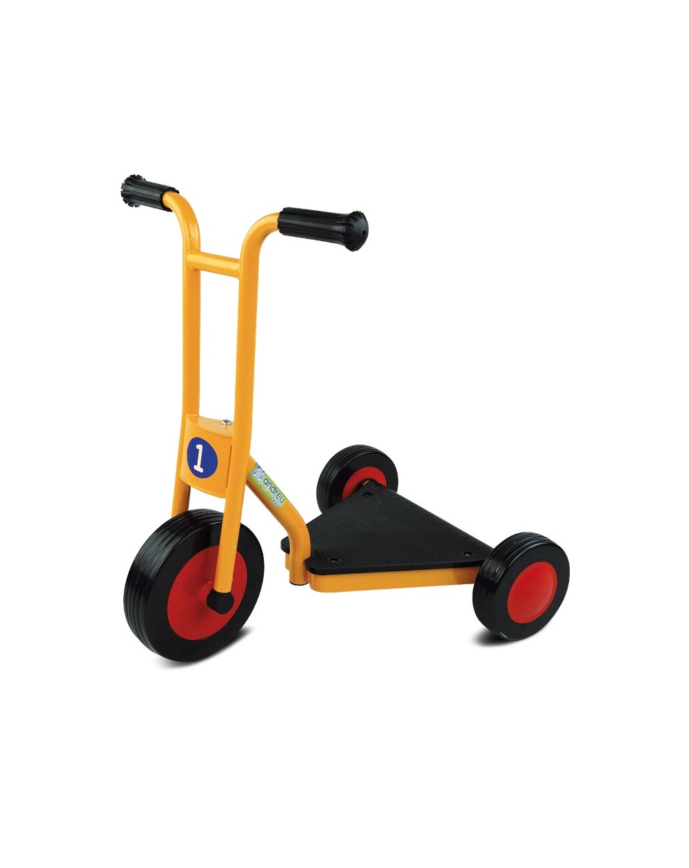 Scooter seguro e resistente especialmente projetado para uso intensivo. Rodas largas sem raios para melhor estabilidade. Está em conformidade com a norma EN71 da CE. É fácil de montar. Oferecemos peças de reposição.