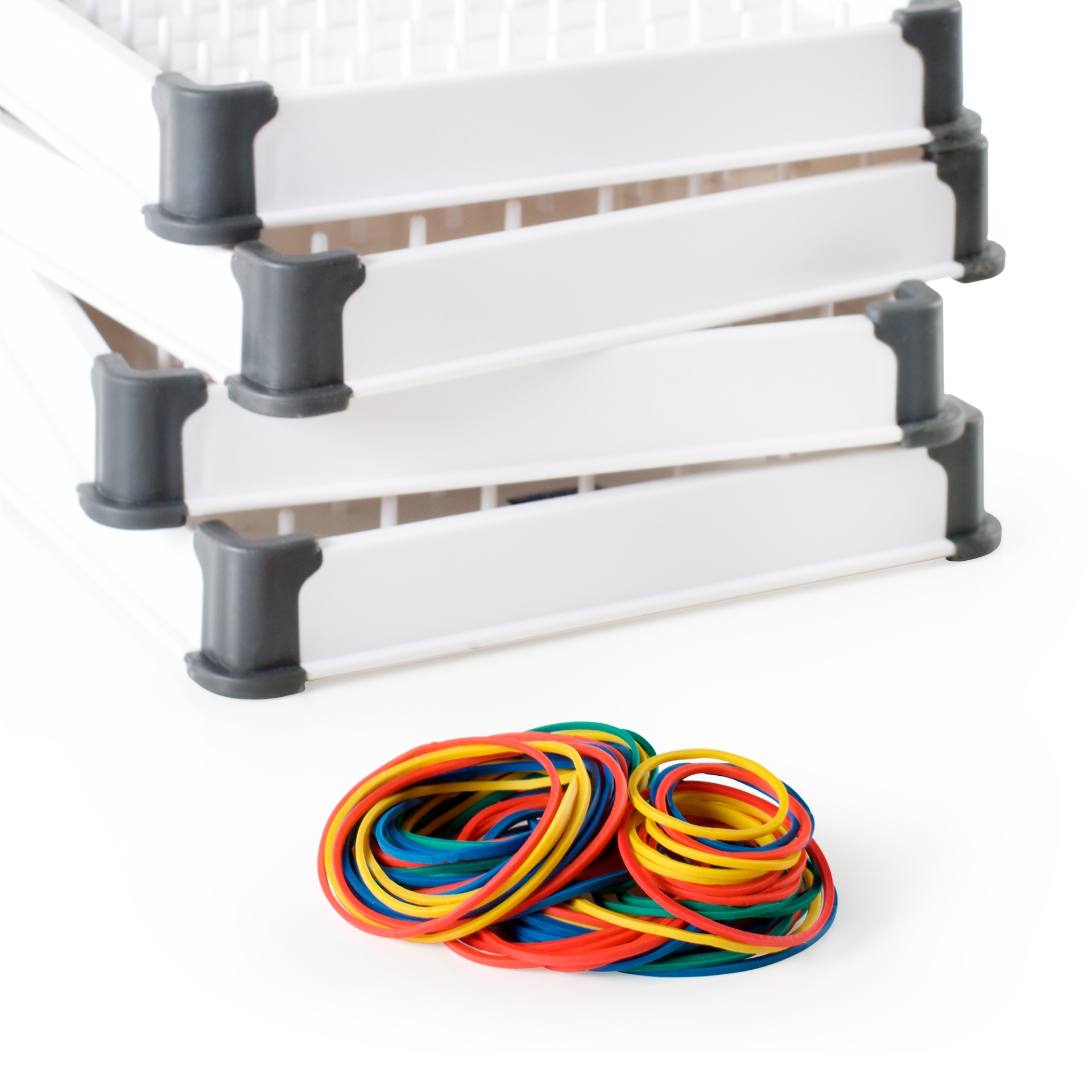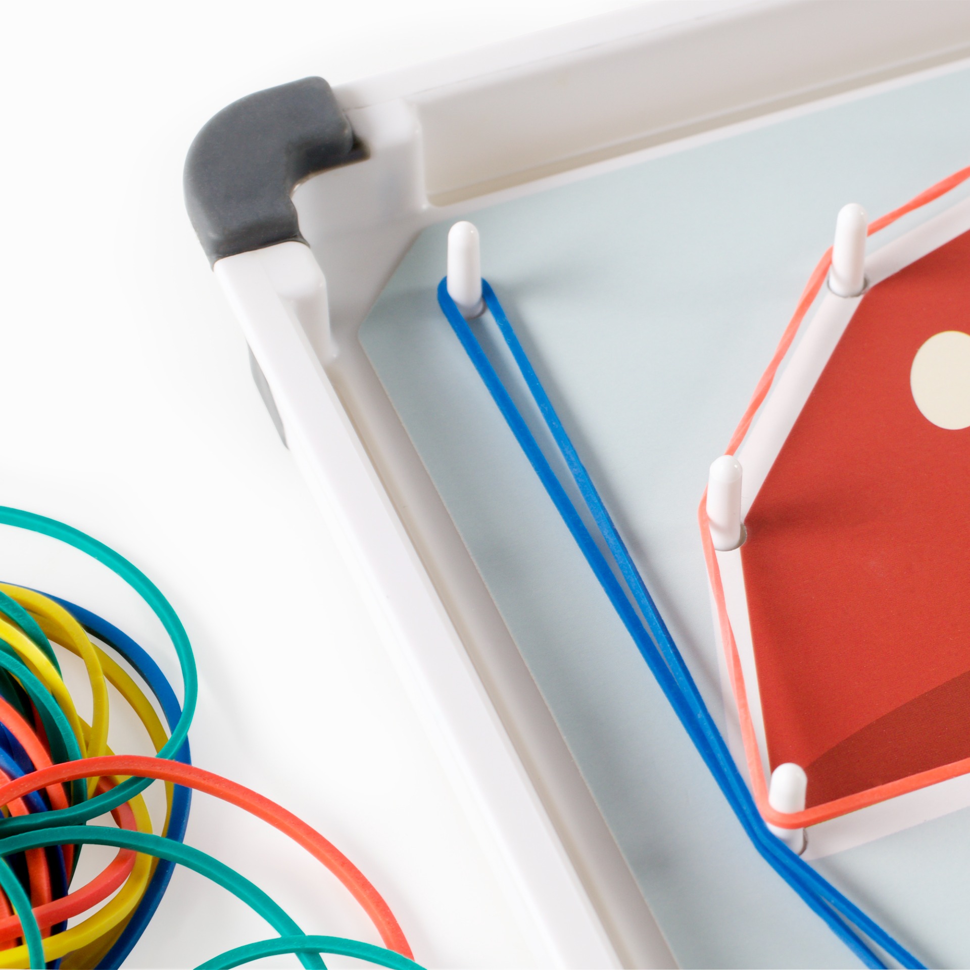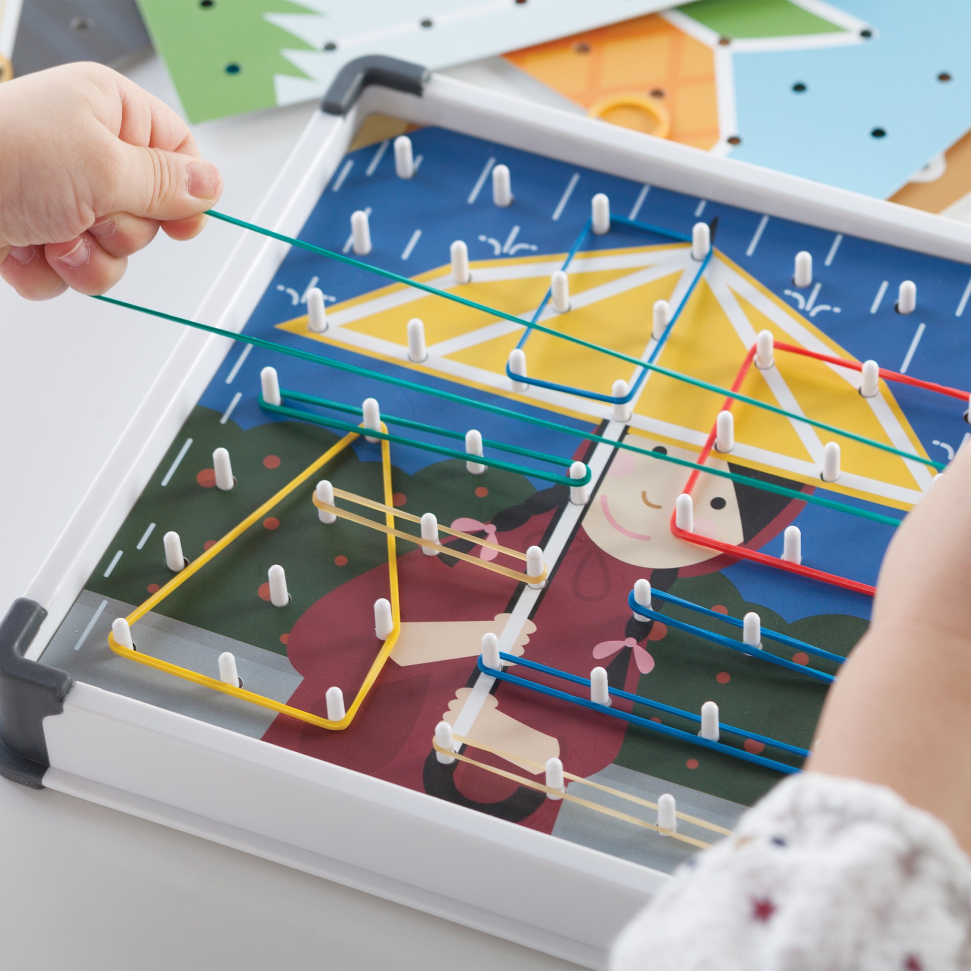 4 conjuntos de elásticos multicoloridos estão incluídos para sobrepor os pinos no quadro para criar as imagens geométricas mostradas nos cartões de atividade.