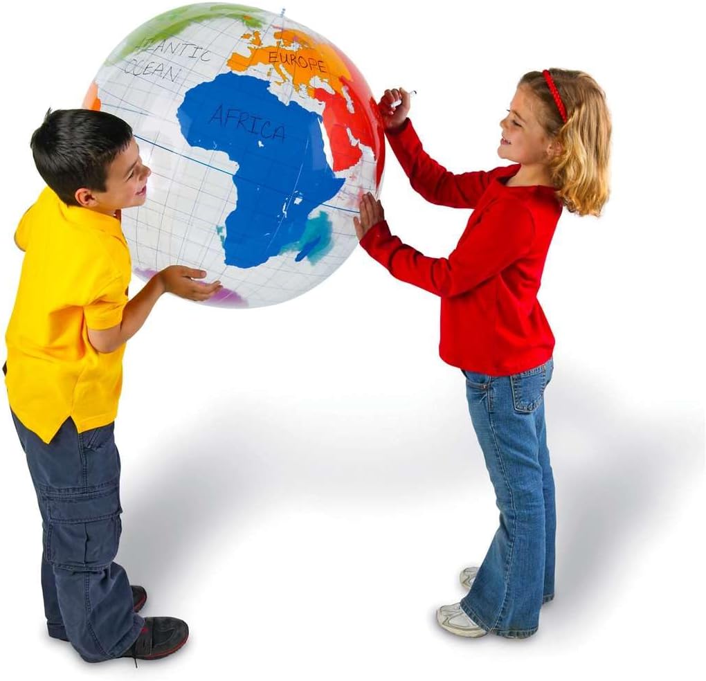 Material Durável: Fabricado em vinil resistente, este globo inflável tem 69 cm de diâmetro, oferecendo uma superfície espaçosa para escrever e identificar países, oceanos e características geográficas.