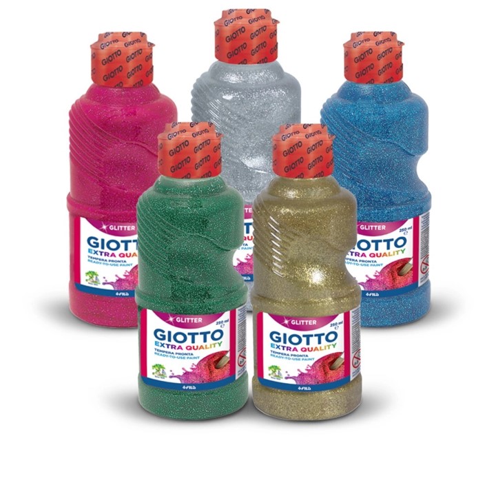 Faça os seus trabalhos brilharem com as 8 cores Giotto extra quality glitter. Com milhões de brilhos este guache é fácil de aplicar e é ideal para a pré-escolar ou projetos em casa. À base de água é seguro como todos os guaches Giotto, apresentam-se em uma garrafa ergonómica, com tampa doseadora. As cores ouro e prata são fabricadas com um gel e podem ser usadas para finalizar ou embelezar objetos. As tintas são laváveis das mãos, mas qualquer mancha em tecidos deve ser esfregada com sabão seco enquanto a tinta ainda está fresca e de imediato lavada na máquina a 40 graus.