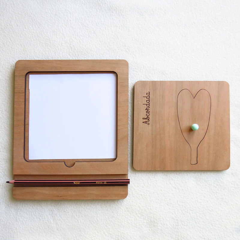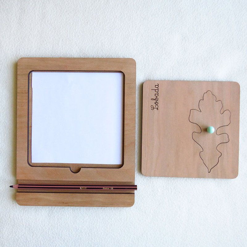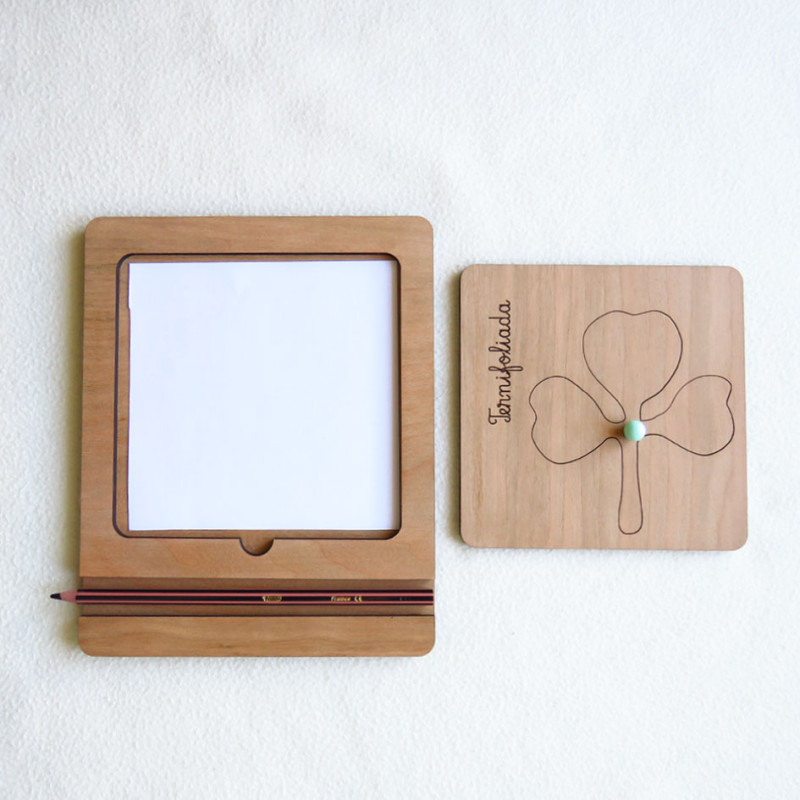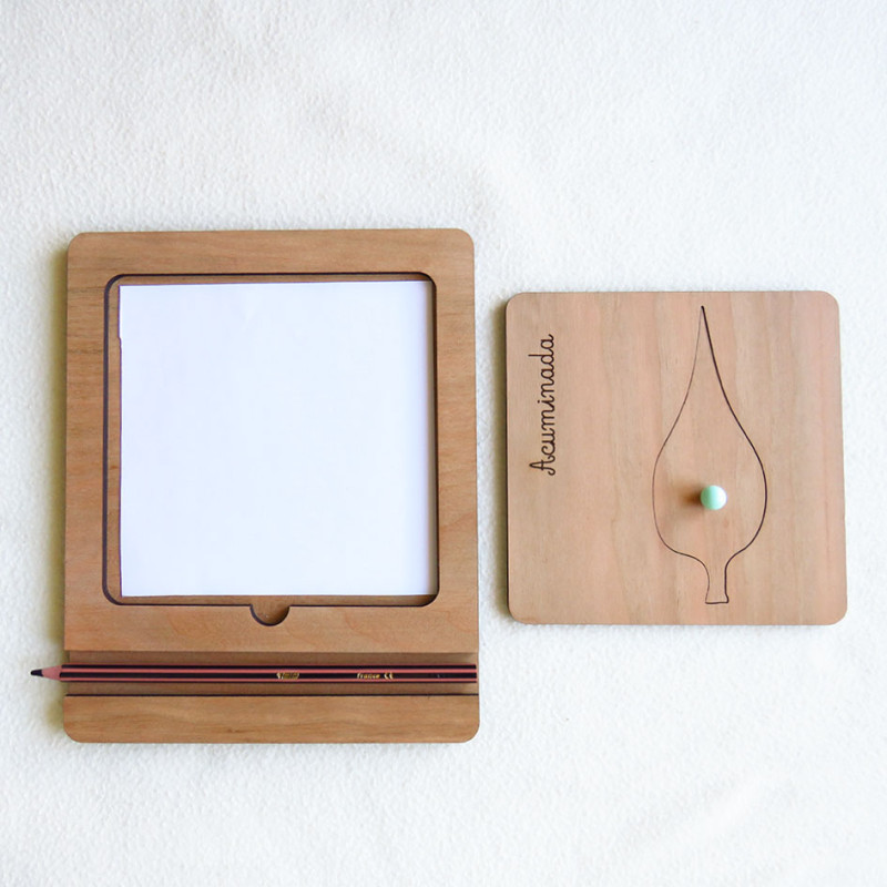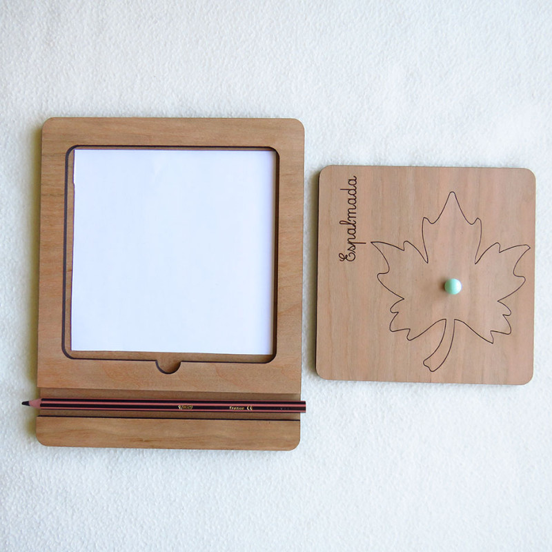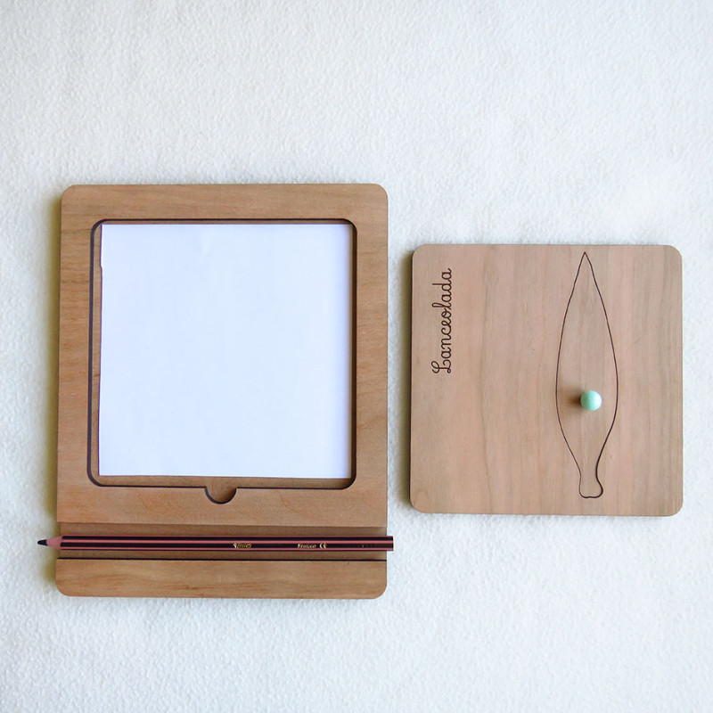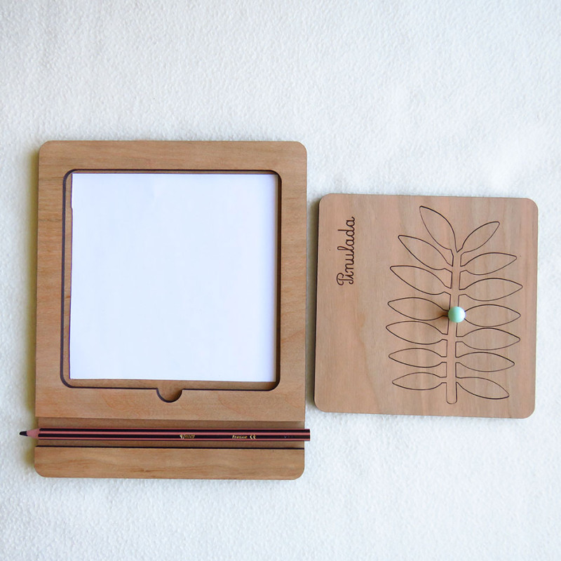 Cada placa é acompanhado de uma base, onde deverá colocar uma folha, para que a criança possa traçar a forma, podendo assim usar o stencil (traçado interno) ou a folha sozinha (traçado externo).