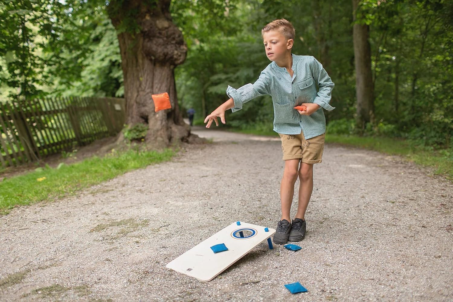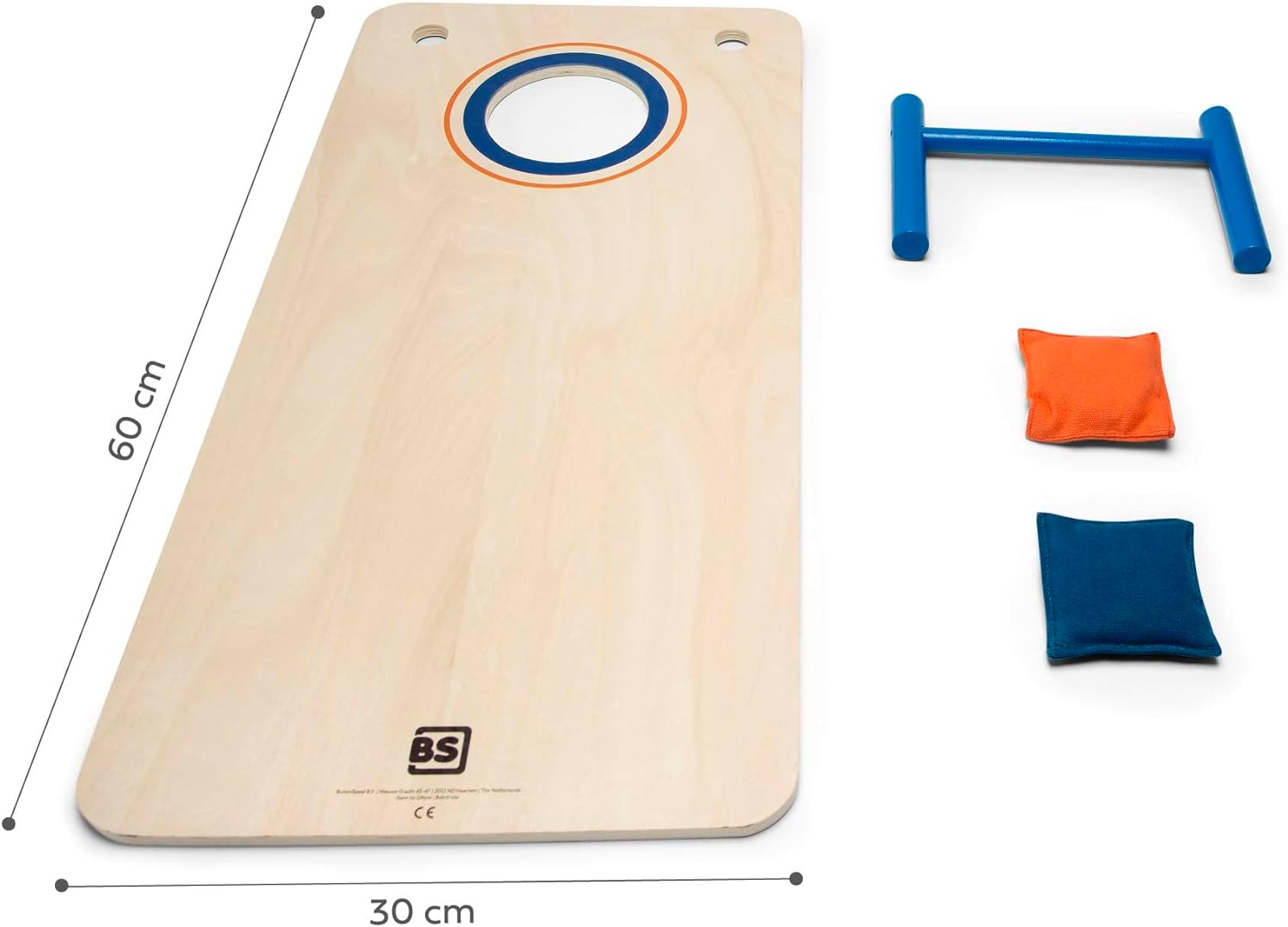 Coloque as placas uma de frente para a outra. Prepare as equipas e se revezem no lançamento. Marque 1 ponto para as sacolas que estão no tabuleiro e 3 para as sacolas que vão para o buraco.