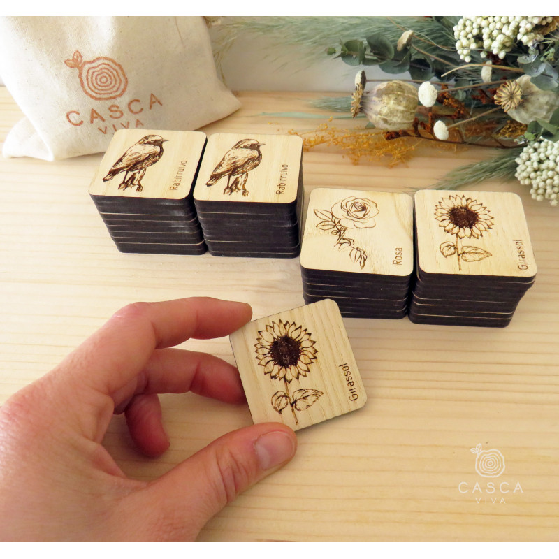 O objectivo é colocar as peças todas viradas para baixo e ir virando duas de cada vez, até encontrar todos os pares.