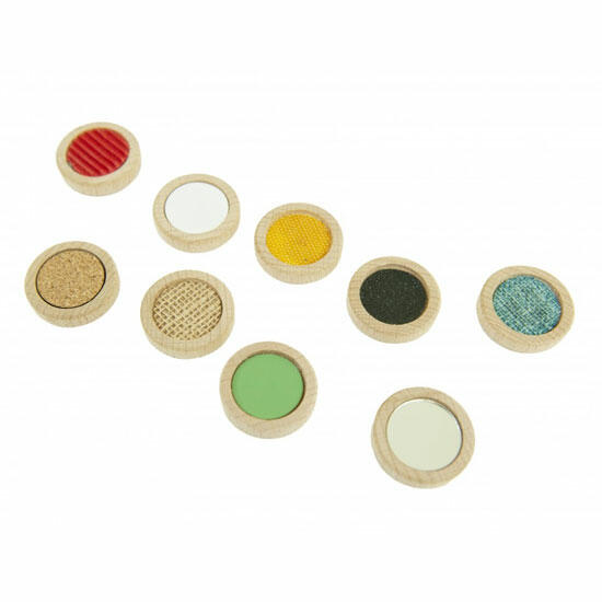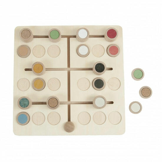 Coloque as peças táteis nos 9 locais desejados. O jogador deve combinar os pinos e as peças com texturas, usando o tato e sem visualizar o jogo, deslizando os pinos ao redor do tabuleiro até que estejam localizados em seus lugares correspondentes. Vire as peças sensoriais no tabuleiro e jogue para combinar as peças por cor.
