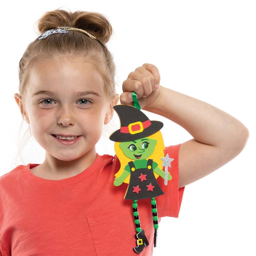 Cada kit inclui modelo de bruxa de espuma, decorações de espuma autoadesivas, contas coloridas e fitaBrand
