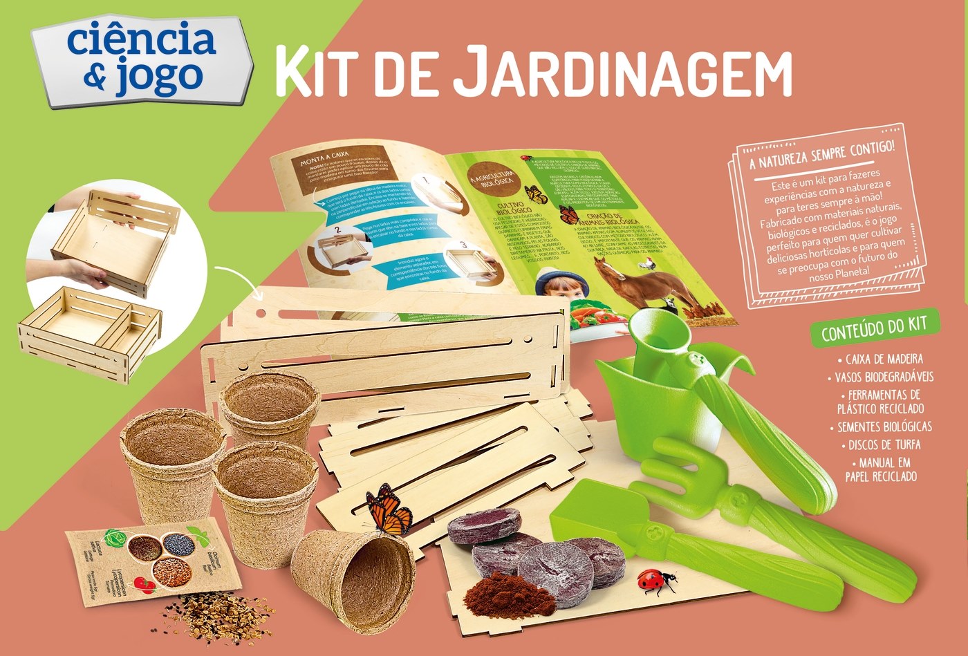 O kit inclui todas as ferramentas essenciais para jardinagem, como uma pá, um ancinho e uma regadora, projetados especificamente para mãos pequenas. Além disso, também vem com sementes de diferentes plantas para as crianças plantarem e cuidarem.