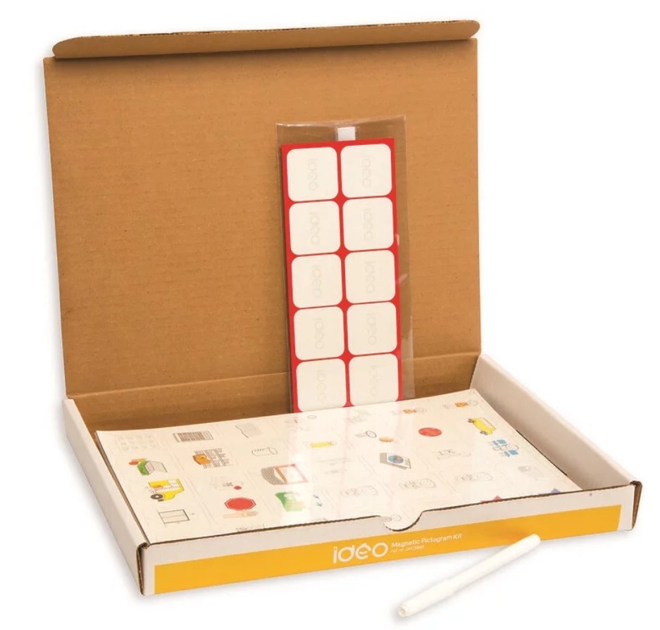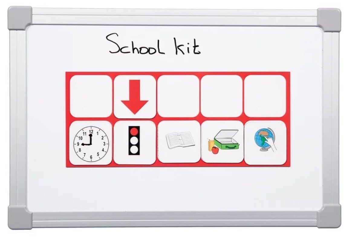 Kit escolar especialmente concebido onde pode seguir uma sequência ou cenário, como no seguinte exemplo: Para uma sequência de artes e ofícios, pode usar: papel, lápis de cor, preto, desenhar, colorir, tesouras, cortar, cola. Os pictogramas magnéticos podem ser organizados em ordem cronológica da esquerda para a direita.
