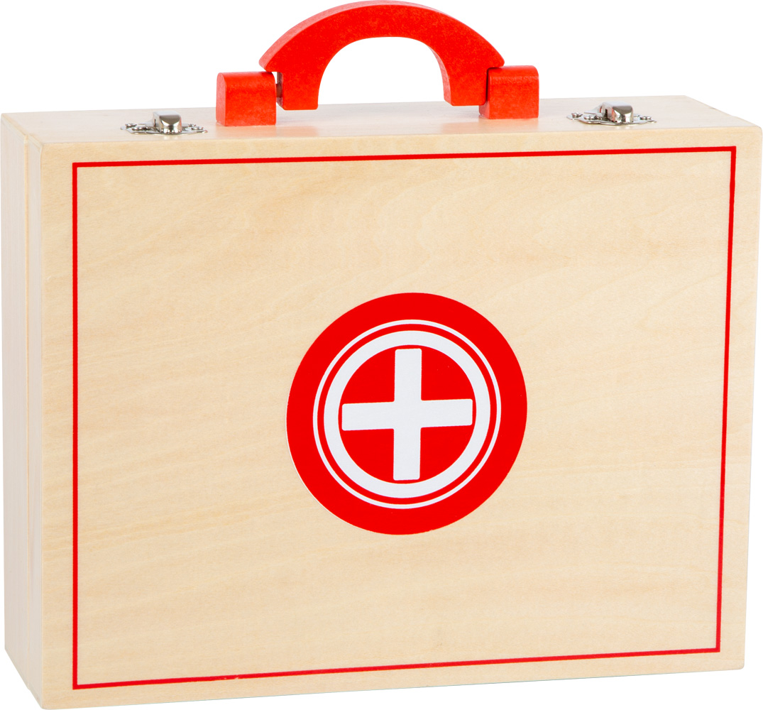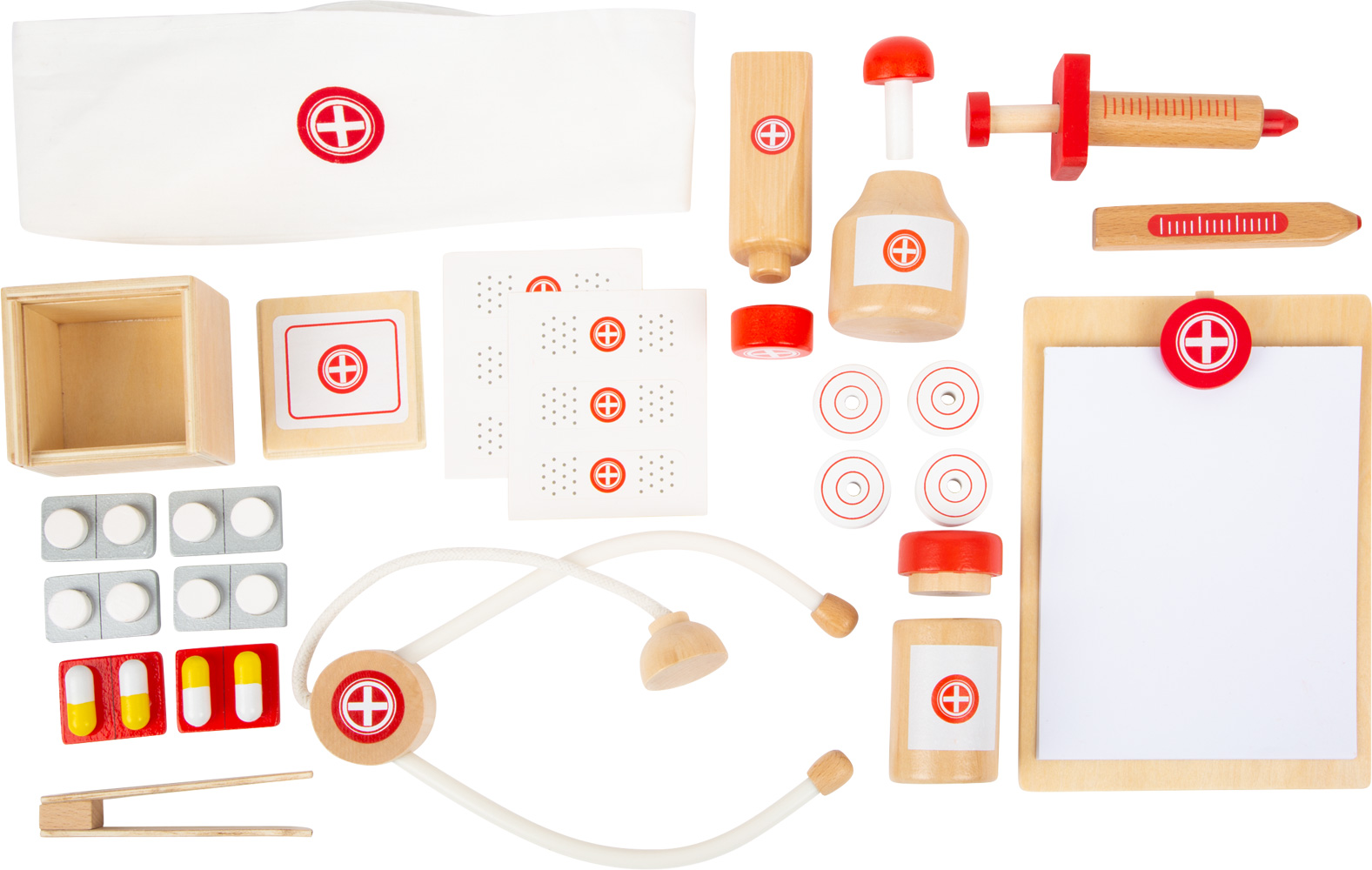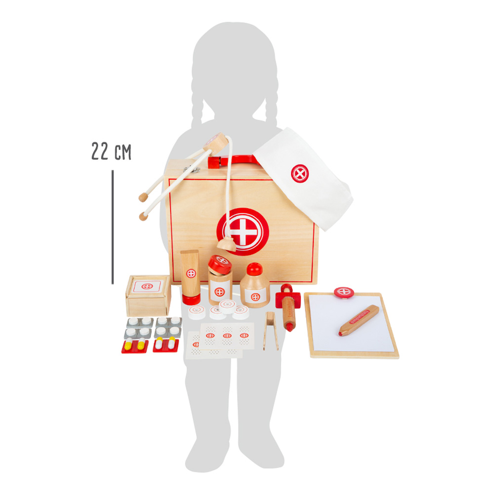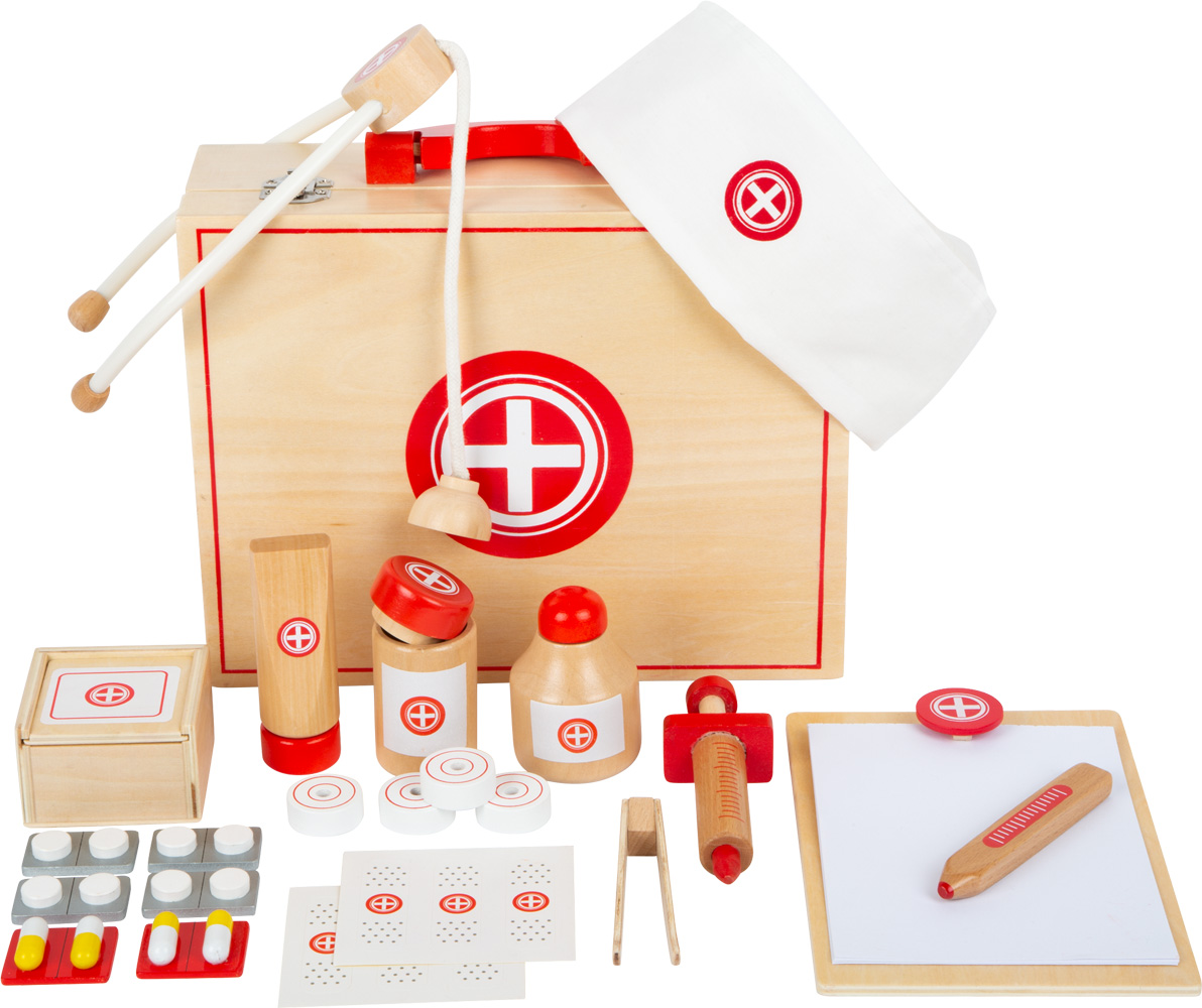Caixa de madeira de alta qualidade com acessórios completos. Adicione alguns materiais de curativo e o pequeno médico estará melhor preparado para visitas domiciliares.