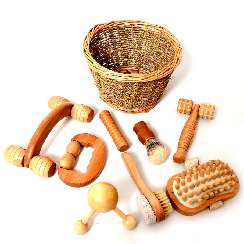 Cesta de Elementos de Massagem: Uma cesta com diferentes elementos para massagem, proporcionando uma experiência sensorial calmante e relaxante.