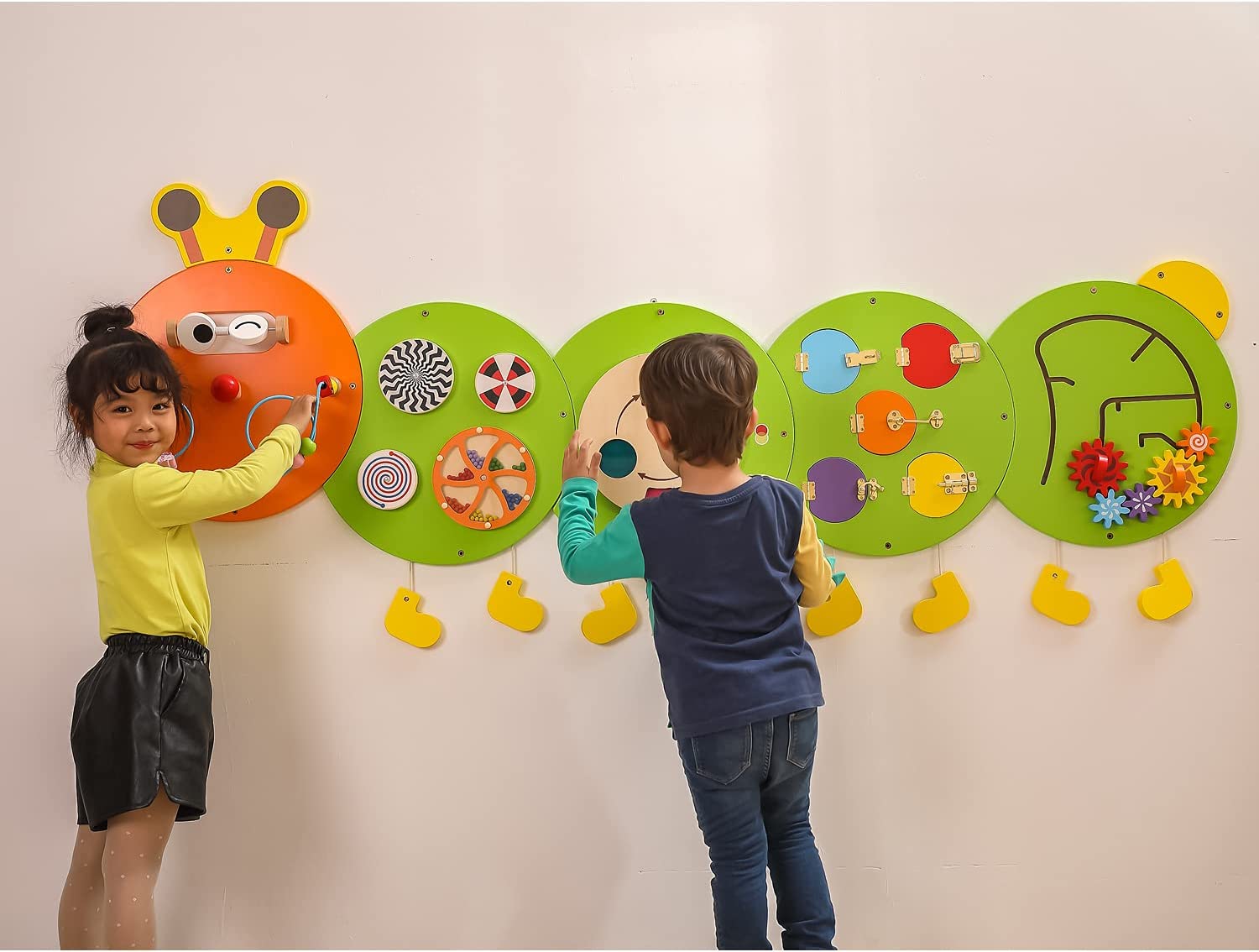 Um brinquedo de parede multifuncional com uma adorável imagem de uma lagarta, incluindo contas de arame, dados rolantes com som e padrões bonitos, fechadura e engrenagens giratórias.