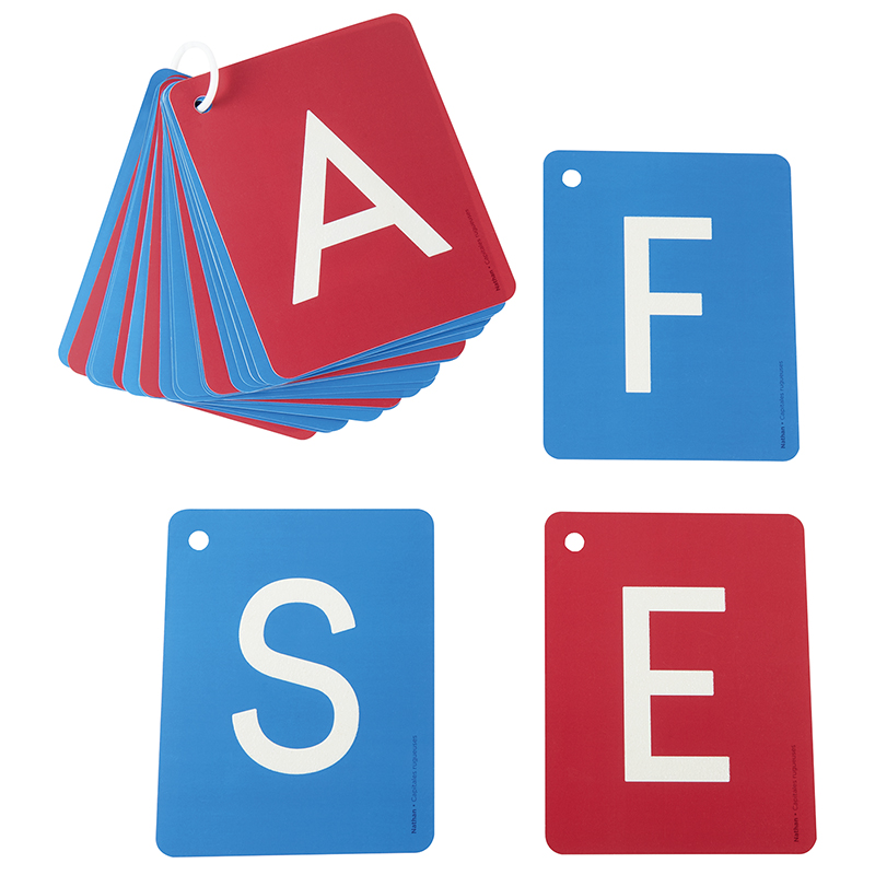 Material concebido para a descoberta sensorial das letras maiúsculas. Inclui 2 conjuntos com as 26 letras do alfabeto, unidos por um anel amovível. As vogais apresentam fundo rosa e as consoantes fundo azul, facilitando a diferenciação.