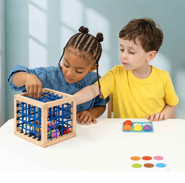 As crianças colocam a(s) mão(s) através dos elásticos para colocar ou retirar diferentes tipos de objetos. Podem explorar vários percursos e descrever verbalmente as sensações que experimentam durante a atividade.