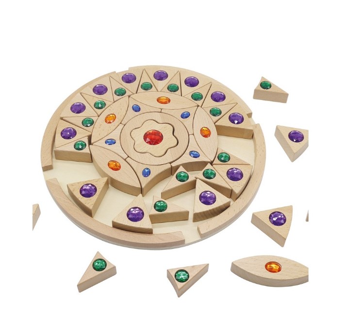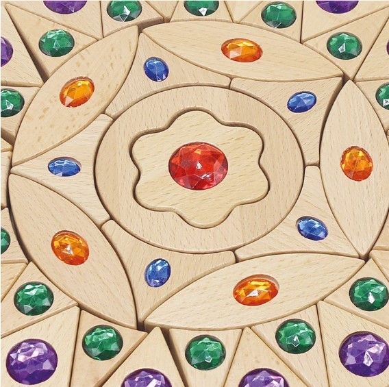 Uma mandala encantadora feita de 44 peças de madeira sólida, resistentes e seguras, com incrustações de gemas coloridas (vermelho, azul, laranja, verde e lilás).