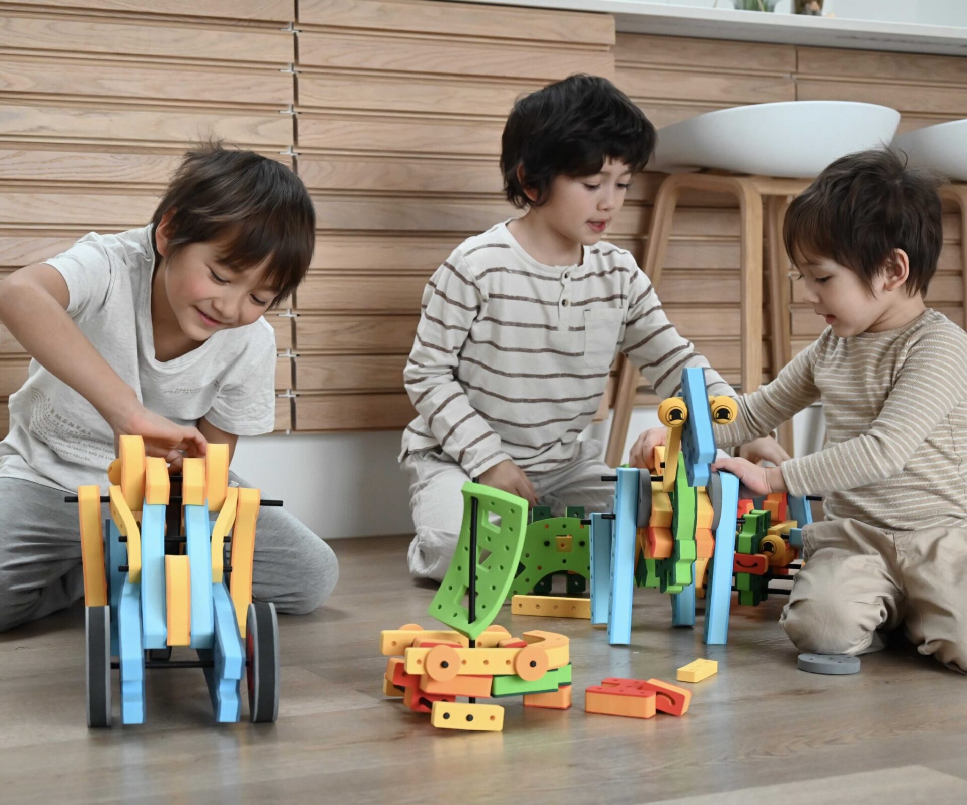 O seu design silencioso cria um ambiente calmo e concentrado, perfeito para o trabalho em grupo e para promover a colaboração e a comunicação entre as crianças — sem o ruído característico dos blocos de plástico ou madeira.