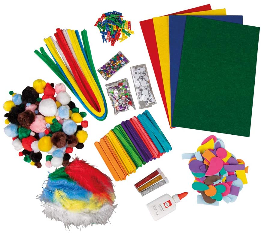 Conteúdo: 500 lantejoulas 250 strass acrílico 120 formas de crepla 100 pompons 100 olhos bambos 72 palitos de artesanato 48 mini pregadores de roupa de madeira 15 penas fofas 10 fios de chenille 4 peças de feltro 3 enfeites finos 1 cola de artesanato = é também incluído Necessita também de: tesoura, base (papel/cartão, madeira, vidro, isopor, ...),