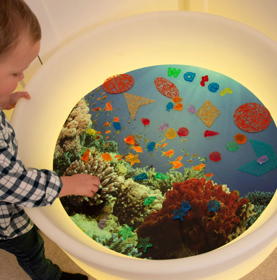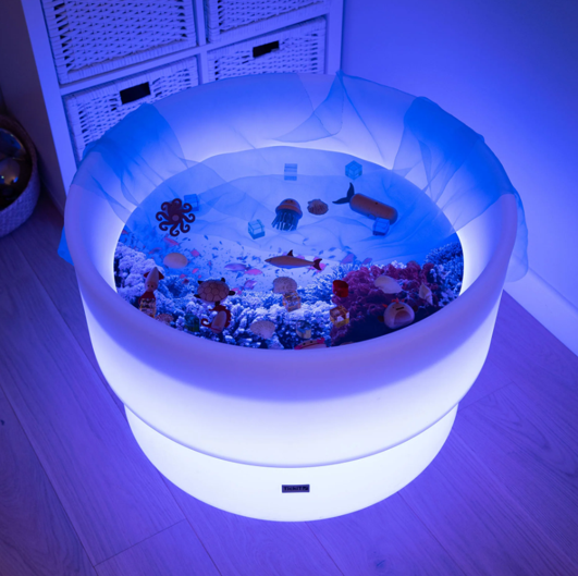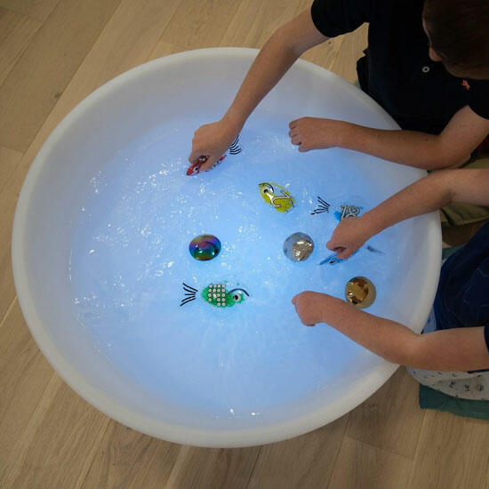 Utilizando o controlo remoto, pode iluminar a mesa com um suave brilho de cores em mudança. A área de exploração profunda pode ser preenchida com água, gelatina, espuma ou objetos translúcidos, proporcionando uma forma divertida de investigar formas, luz e cor através de brincadeiras sensoriais. Que tal fechar as cortinas e criar um ambiente escuro, transformando a Mesa de Água Mood num colorido caldeirão? Encha o recipiente com objetos táteis emocionantes e texturas para que as crianças explorem este novo ambiente envolvente.