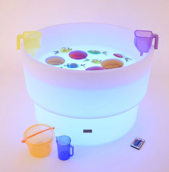 O perfil fino da mesa torna-a fácil de mover entre os ambientes, e o design robusto, mas leve, facilita a alternância entre brincadeiras interiores e exteriores. Como todas as Luzes Sensoriais Mood tickit®, a mesa de água é fácil de limpar. Ela proporciona um excelente ambiente para brincadeiras colaborativas, e a altura foi projetada para permitir fácil acesso ao conteúdo pelas crianças. Os lados e o fundo do poço interno foram cuidadosamente elaborados para facilitar o preenchimento com apenas uma pequena quantidade de líquido ou outros materiais, se necessário.