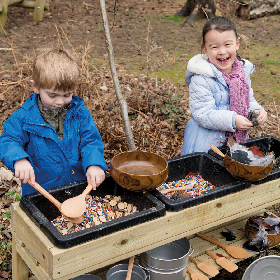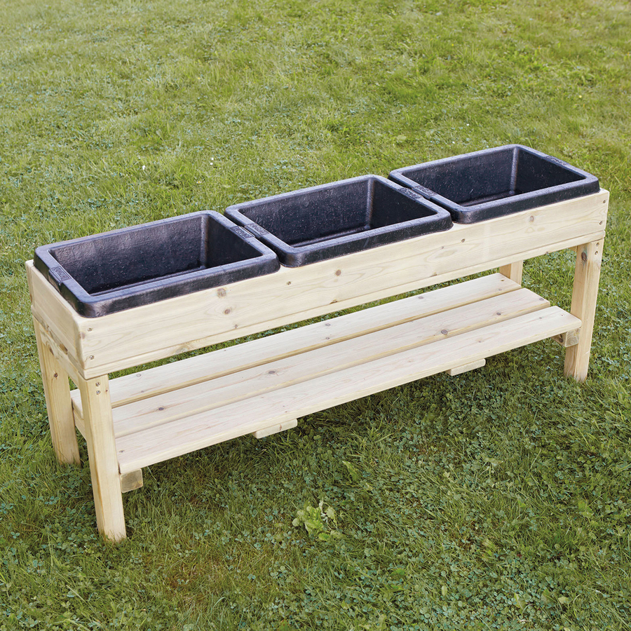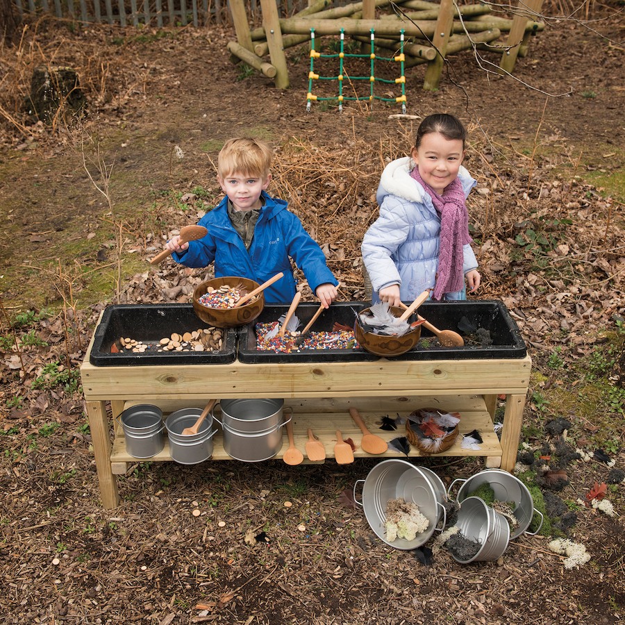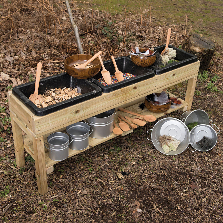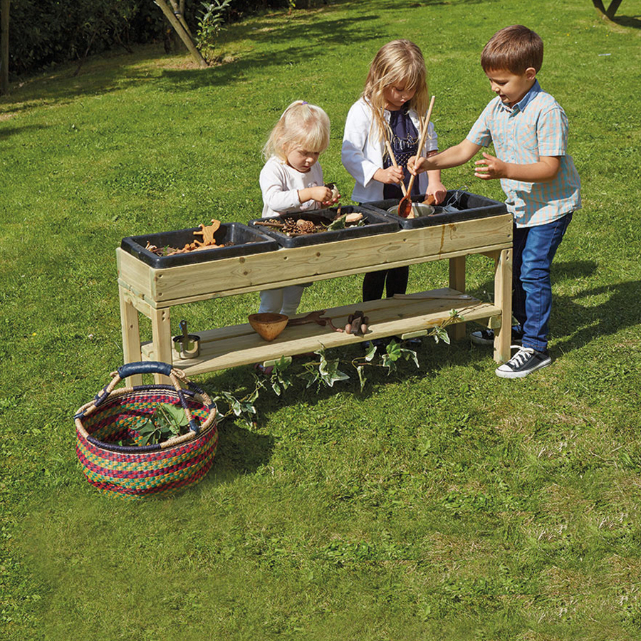 Uma mesa de tesouros ao ar livre com três compartimentos, projetada para inspirar brincadeiras desordenadas e criativas.