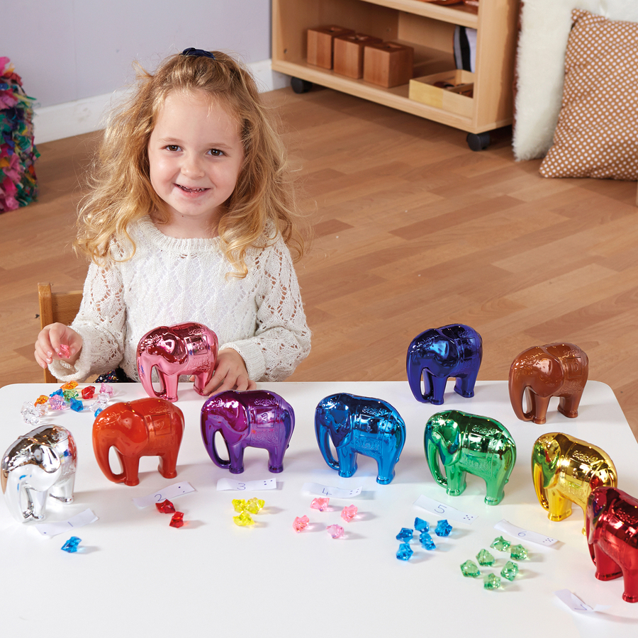 Um conjunto encantador de elefantes metálicos com um brilho único, concebido para estimular a numeracia e o jogo imaginativo nos primeiros anos.