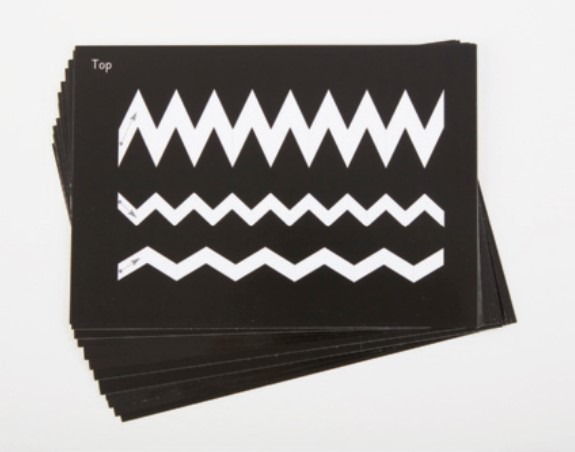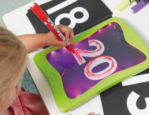 Cartões de inserir robustos concebidos especificamente para caberem dentro dos Mini Quadros de Grafismos Iluminados, com números, letras e padrões para traçar.
