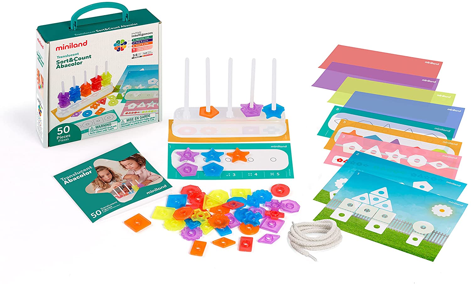 O ábaco translúcido da Miniland geralmente tem várias filas de contas coloridas, que deslizam ao longo de varetas ou fios. Cada fila costuma ter dez contas, e as contas podem ser agrupadas em diferentes seções para representar números maiores. As crianças podem mover as contas para a frente e para trás para fazer cálculos.