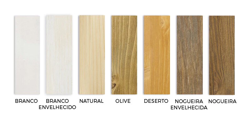 Acabamentos: Nogueira, Nogueira Antiga, Azeitona, Deserto, Branco, Branco Antigo e Natural.