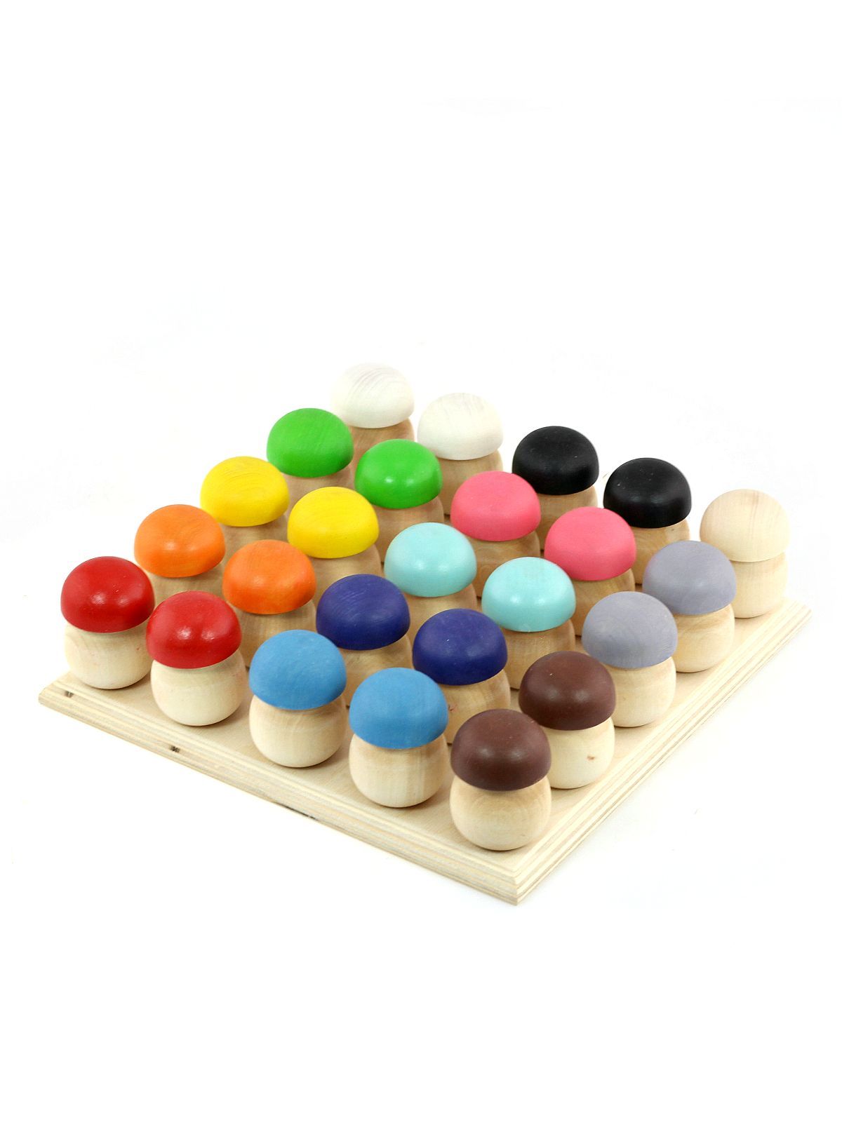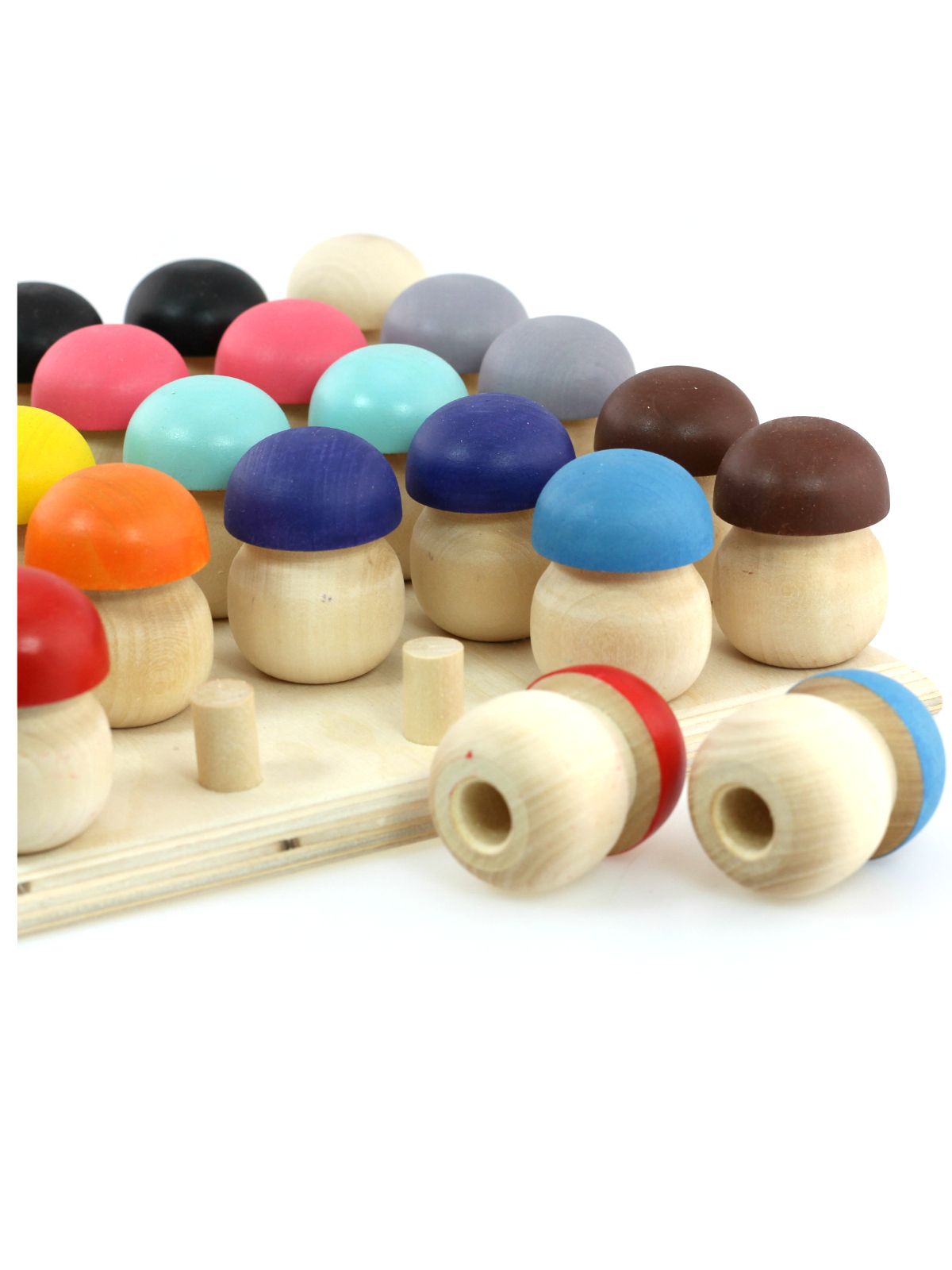 Este conjunto de estilo aberto inclui 25 cogumelos de madeira, um suporte de madeira e uma bandeja especialmente concebida para manter tudo organizado.