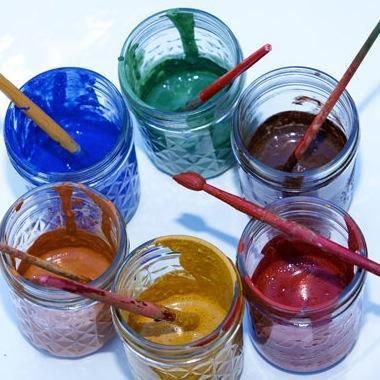 Um conjunto completo de tinta ecológica em seis cores, ideal para crianças pequenas pintarem com pincéis ou apenas para usar como tinta para os dedos.