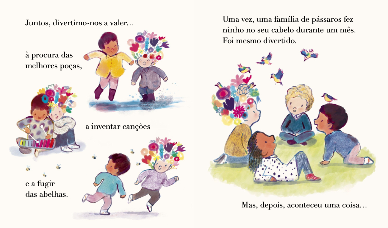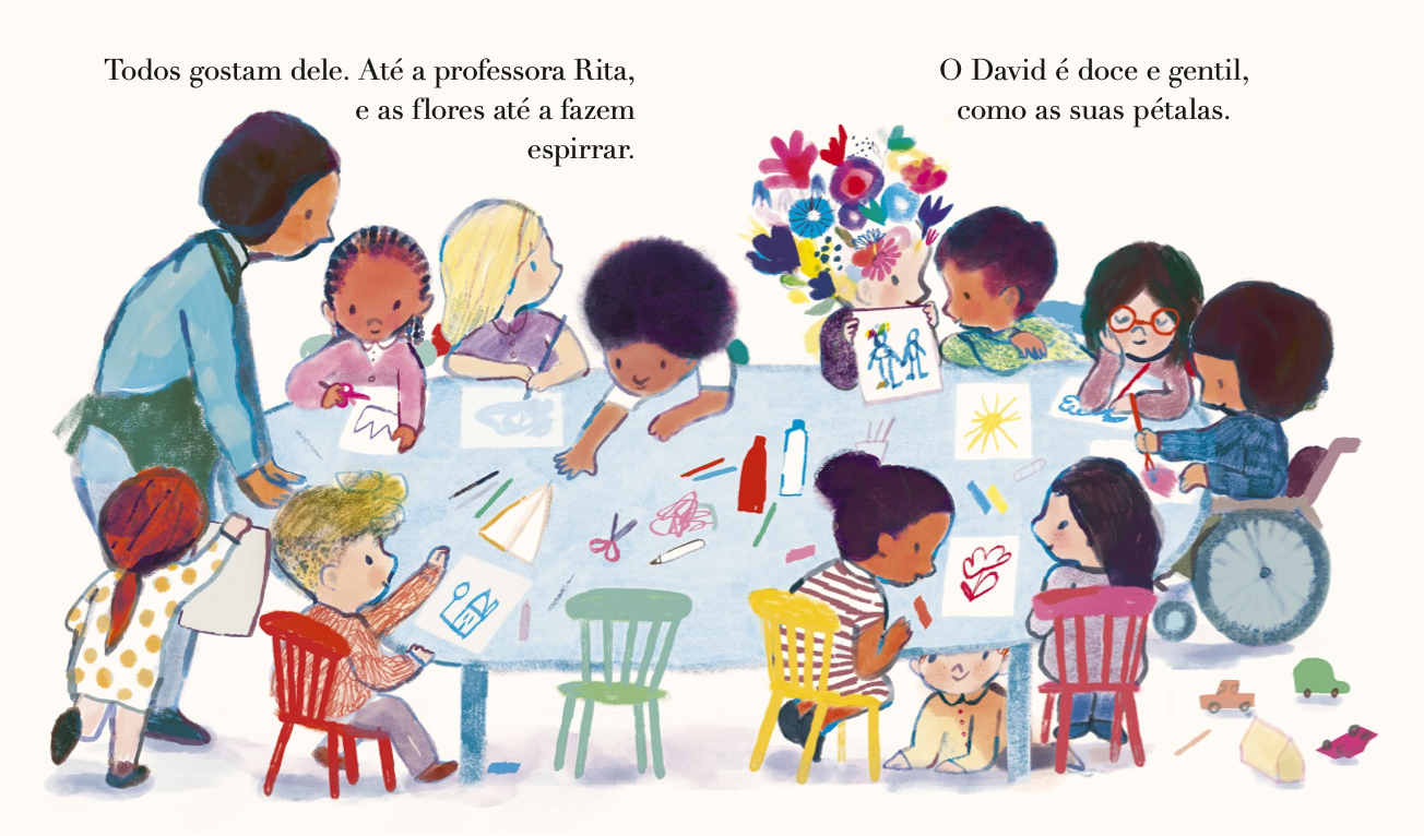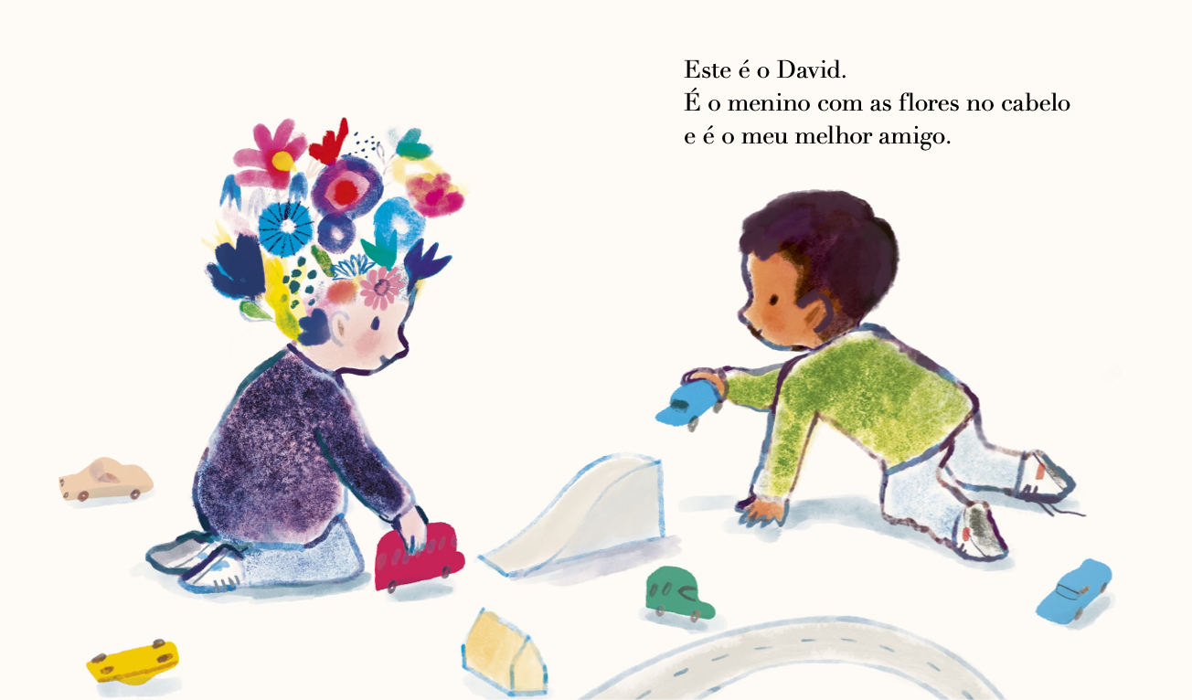 O David é o menino com flores no cabelo. Ele é doce e gentil, assim como as suas pétalas. Mas quando as flores lhe começam a cair uma a uma, até não sobrar nenhuma o seu melhor amigo nunca sai do seu lado.
