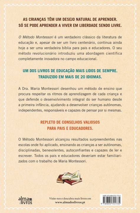 O Método Montessori é um verdadeiro clássico da literatura de educação e, apesar de ser um livro centenário, continua ainda hoje a ser uma verdadeira bíblia para pais e educadores. O seu método revolucionário introduziu uma abordagem científica completamente inovadora no campo educacional.