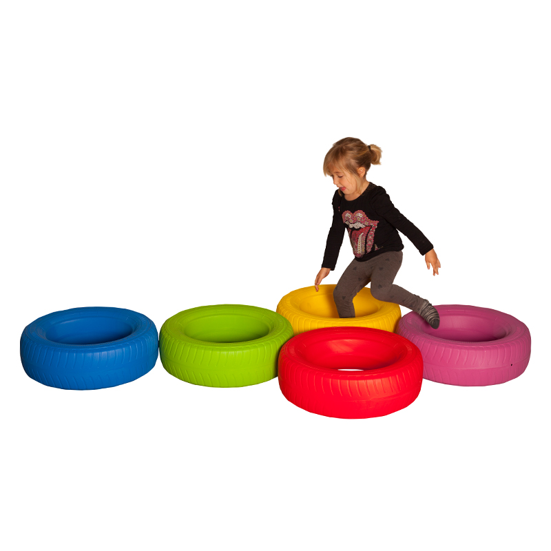 Jogo clássico de recreio composto por 5 pneus de plástico pneumático em cores atraentes, projetados para realizar diferentes exercícios de psicomotricidade. Os pneus incorporam uma gravação realista com grande detalhe e são completamente fechados no interior para evitar lesões.
