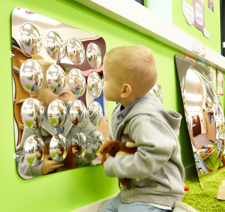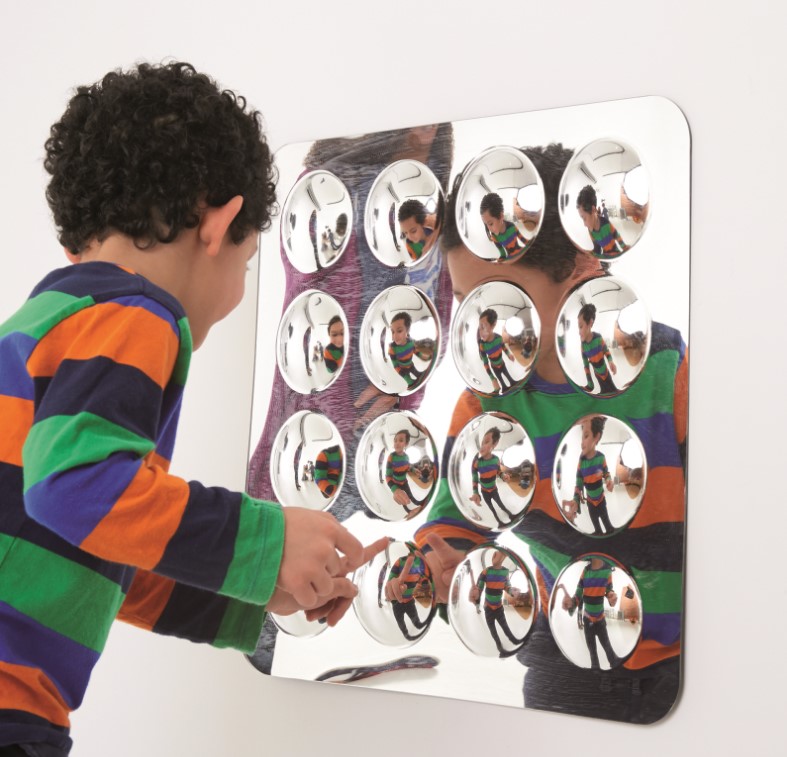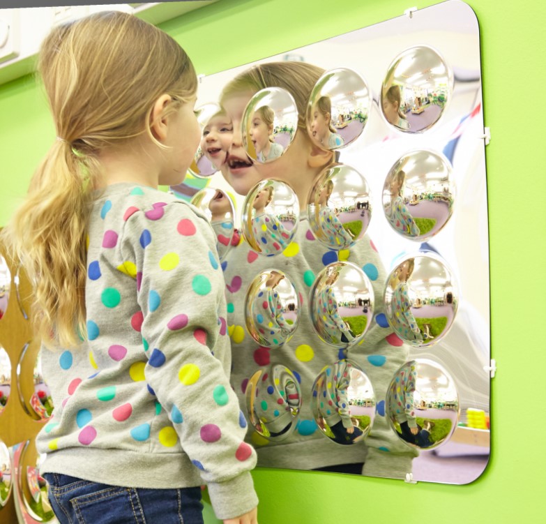 Fabricado em acrílico resistente a riscos, este painel com múltiplos espelhos convexos é seguro e ideal para salas de aula, creches e espaços infantis. As crianças adoram observar-se a si próprias e aos objetos à sua volta, explorando diferentes formas e reflexos.