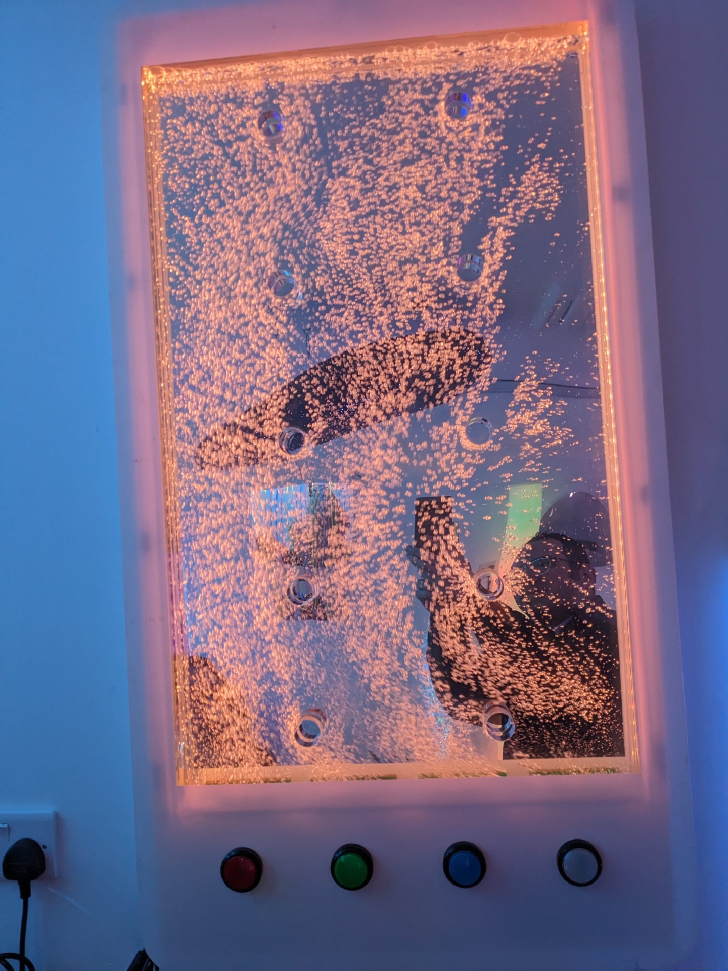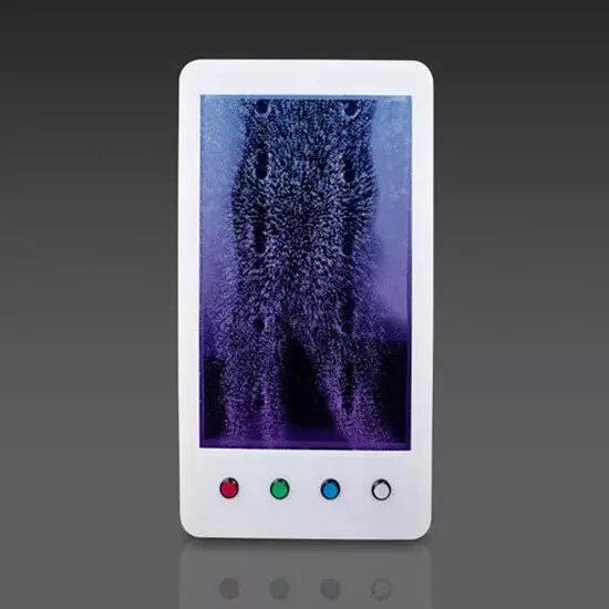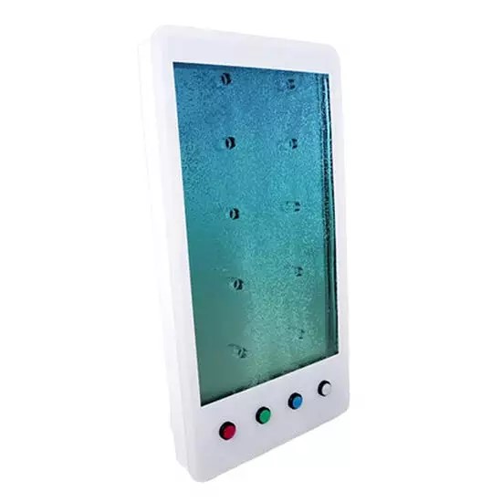 Os quatro botões de controlo — vermelho, verde, azul e branco — permitem ajustar o fluxo das bolhas e alterar as cores das luzes, proporcionando experiências interativas e personalizadas.
