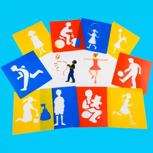 O conjunto inclui 12 stencils gigantes com diferentes temas de pessoas, que podem ser utilizados em superfícies irregulares e ásperas com esponjas, pincéis, lápis, marcadores, tintas prontas e muito mais!