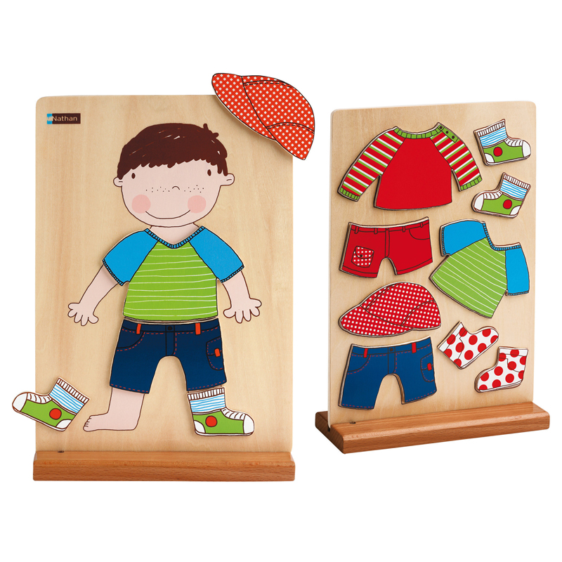 Um jogo magnético em madeira que convida as crianças a vestir o Bob com diferentes roupas, promovendo a autonomia, a criatividade e a compreensão do esquema corporal.
