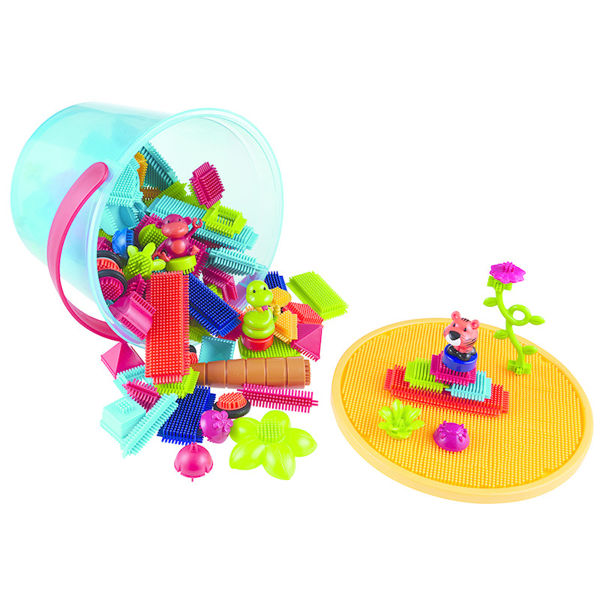 128 peças de plástico em cores vibrantes que se encaixam com facilidade. As construções podem ser móveis ou estáticas. A tampa pode ser utilizada como base para a montagem das peças.