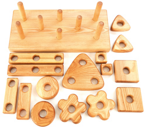 Um bloco base de madeira com postes verticais para construir com uma variedade de formas.