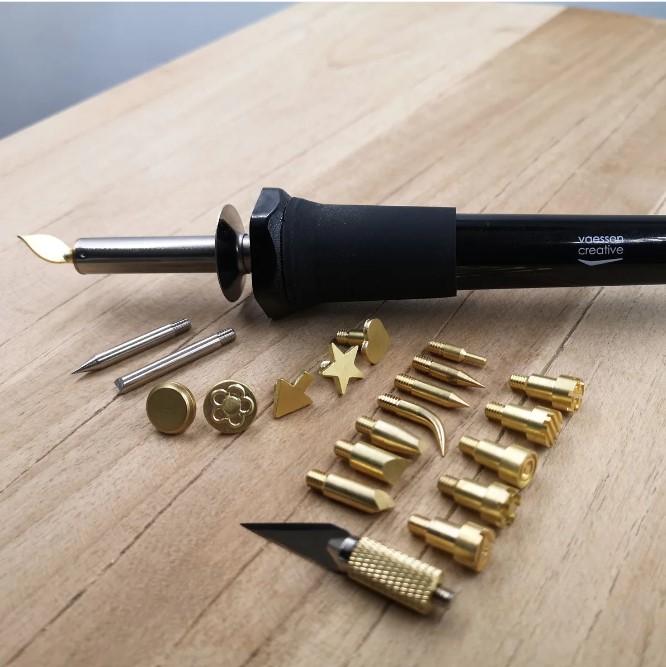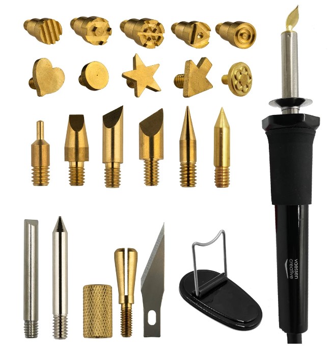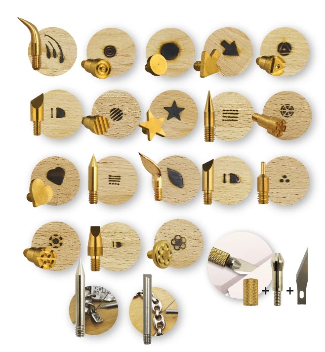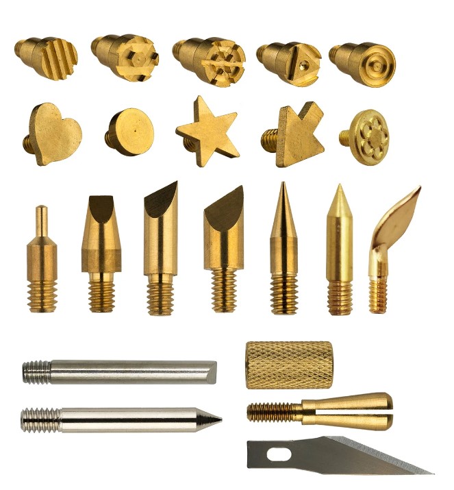 O pirógrafo vem com 23 acessórios diferentes, incluindo pontas de diferentes espessuras e "carimbos" com várias formas.