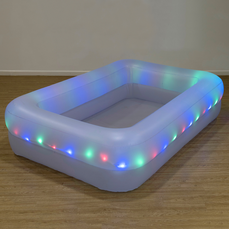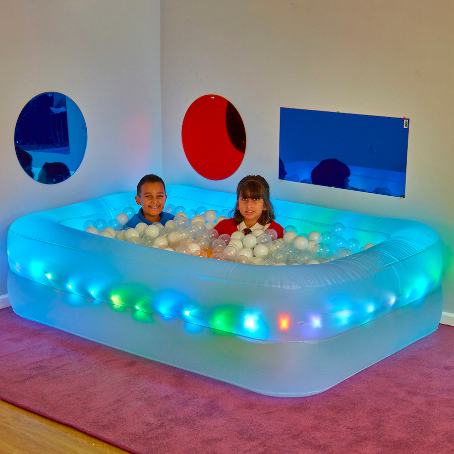 Utilize com dois conjuntos das nossas bolas sensoriais calmantes, que encherão a piscina até 2/3 da sua capacidade (SD10058). Funciona com 4 pilhas AA (não incluídas). As pilhas durarão aproximadamente 4 horas se usadas continuamente no modo intermitente. Modo estático ou intermitente. Luzes vermelhas, amarelas e azuis. Compatível com a nossa bomba de enchimento e esvaziamento (SD10357).