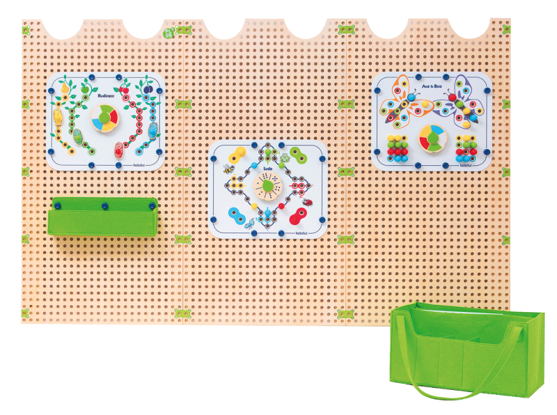 Crianças podem brincar sozinhas, criando padrões ou resolvendo tarefas, ou em grupo, interagindo em conjunto. Os jogos clássicos deixam a mesa e sobem à parede! Um disco giratório substitui o dado, e o melhor: cada criança pode jogar à sua própria altura. Nada precisa de ser arrumado depois!