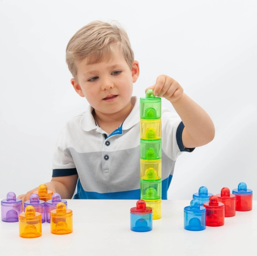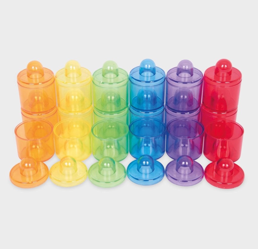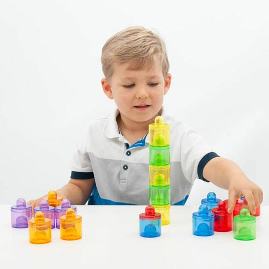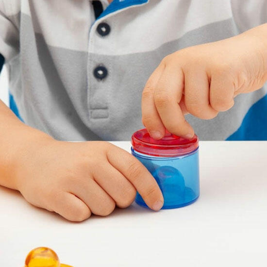 O nosso conjunto de Potinhos de Cor Translúcidos tickit® contém dezoito potes pequenos e empilháveis em seis cores translúcidas diferentes. Cada pote tem uma tampa, sendo ideal para enchê-lo com materiais para brincadeiras exploratórias, mistura e combinação de cores, e atividades de empilhamento. Ajuda a desenvolver a capacidade do seu filho de pensar logicamente e a melhorar a coordenação motora.