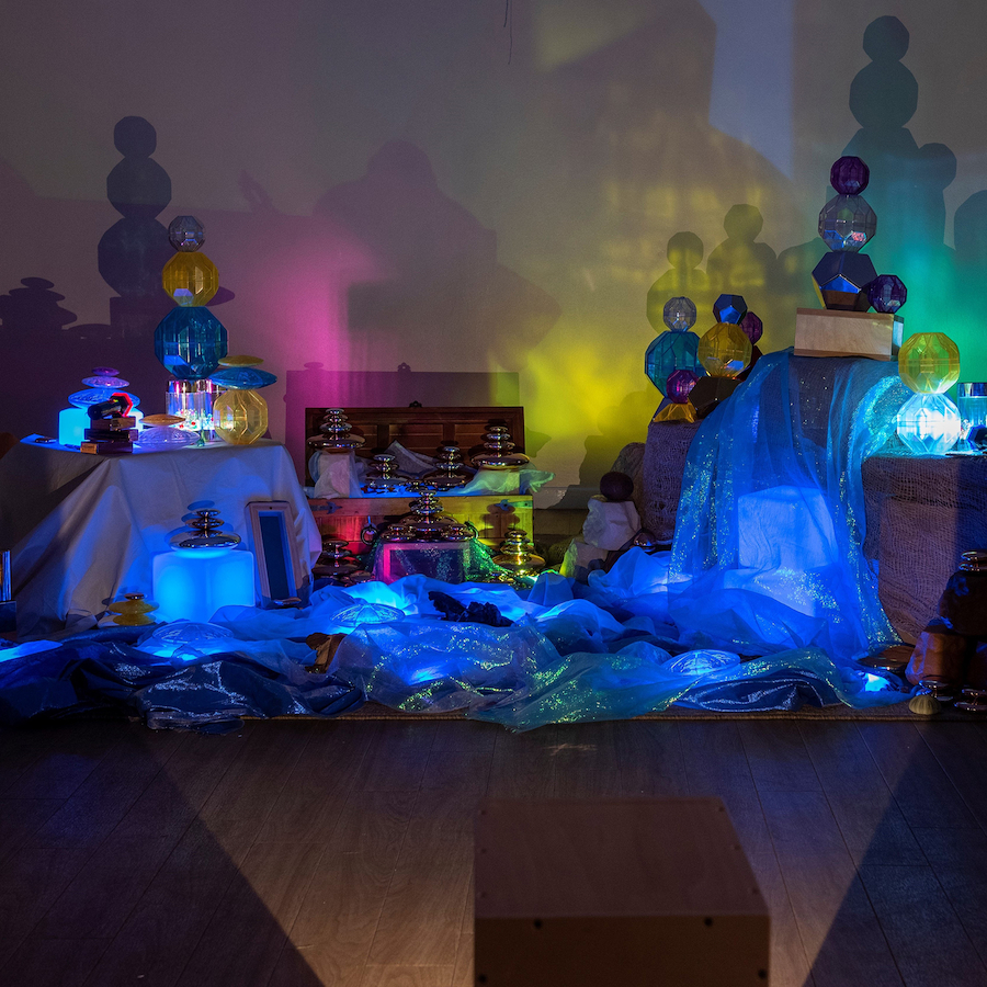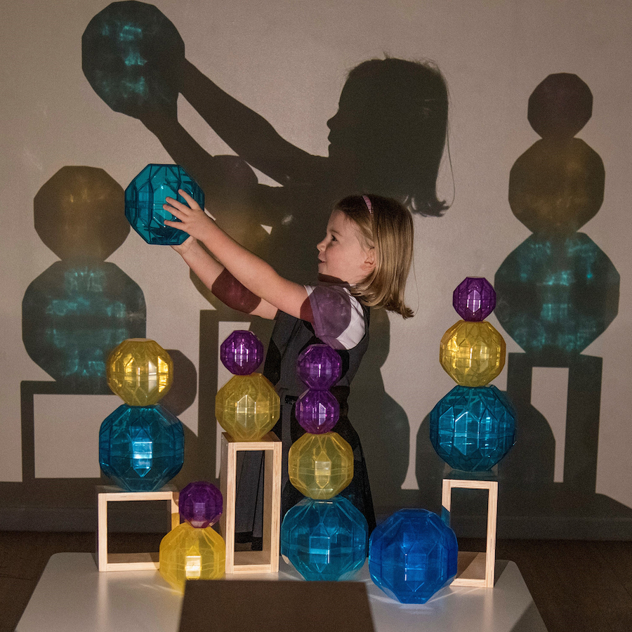 As crianças podem colocar, equilibrar, posicionar e construir todo tipo de peças de arte e depois ver como se transformam em sombras imaginativas.