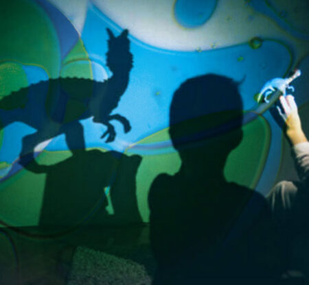 Quando o projetor estiver ligado, ele fará a roda girar, criando uma imagem que gira ou muda continuamente. Se tiver adquirido alguma roda de cor adicional, pode adicioná-la facilmente colocando-a no suporte de diapositivas e deslizando-a à frente da roda principal. Isso mudará o efeito da projeção, seja adicionando um fundo colorido ou colocando uma imagem fixa sobre um fundo em constante mudança.